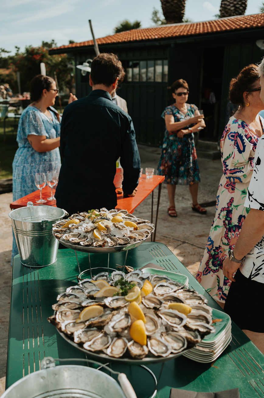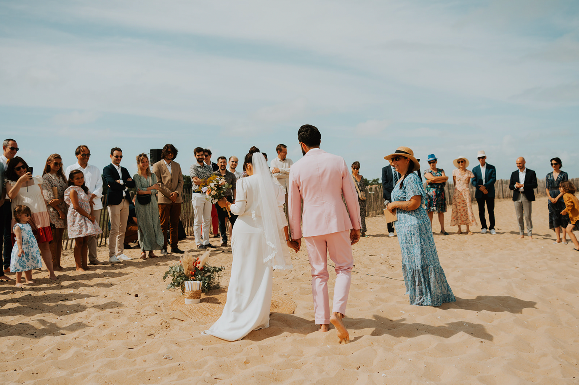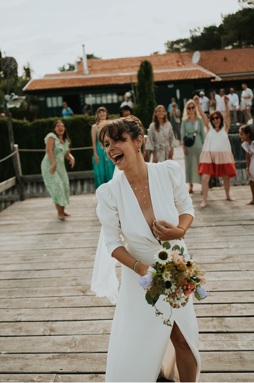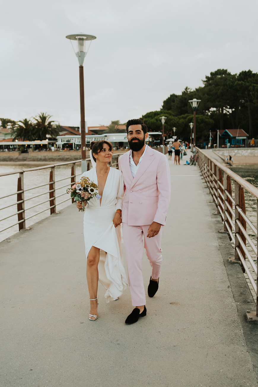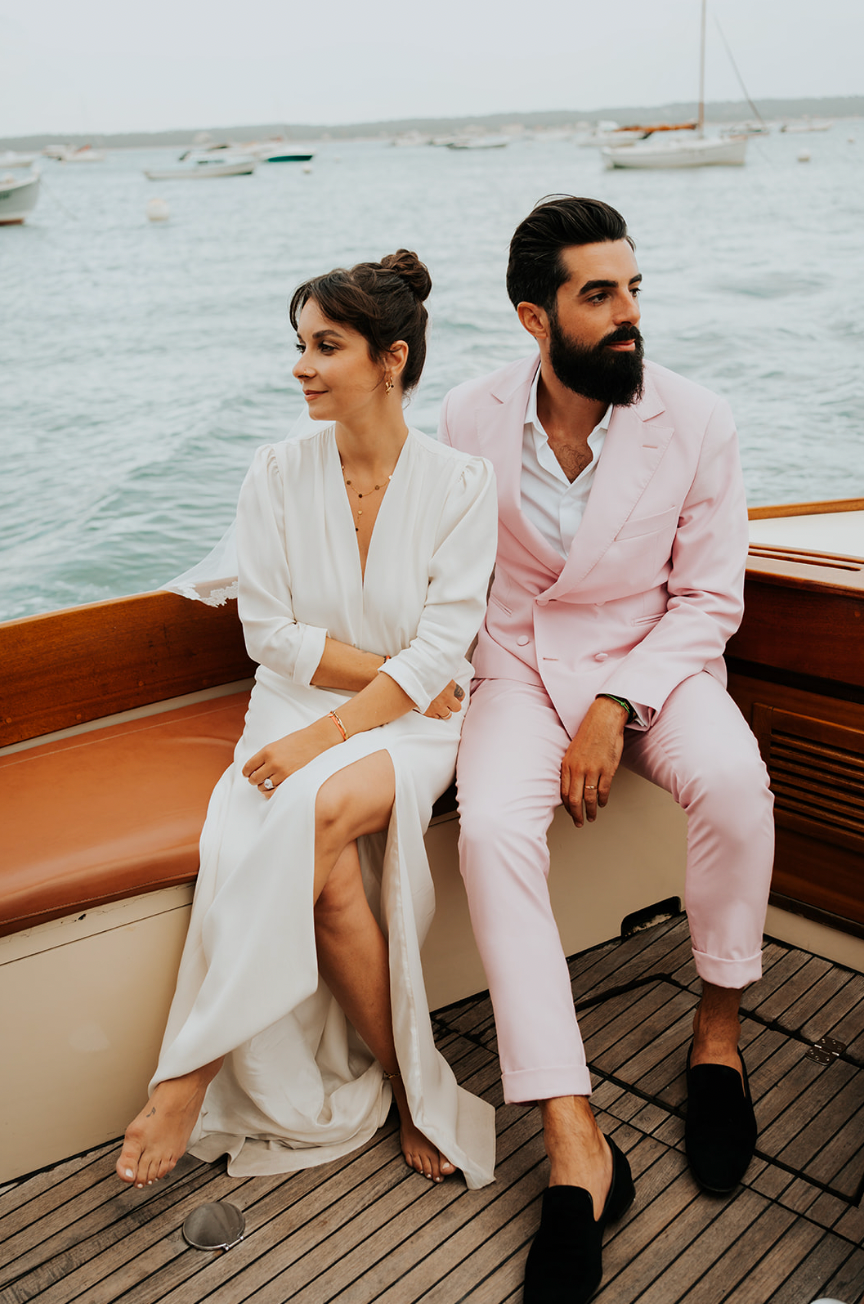 La balade en pinasse sur le bassin d’arcachon. Départ face à la dune après notre cérémonie sur la plage, une bulle de silence et de joie qu’on a vécue juste à deux. On s’est regardé, on a regardé ce paysage à couper le souffle et on a profité de chaque minute de ces deux heures de parenthèse enchantée. Et puis aussi la découverte de nos habits, lui dans son costume rose tendre et moi dans ma robe qui flottait autour de moi que je sentais à peine. Partis pieds nus pour la cérémonie et revenus pieds nus du bateau pour aller danser. L’ouverture de notre soirée avec notre chiot fraîchement arrivé dans nos vies dans mes bras. Il était tout doux avec son poil de bébé et je suis sure qu’il m’a trouvée très douce dans ma sublime robe!