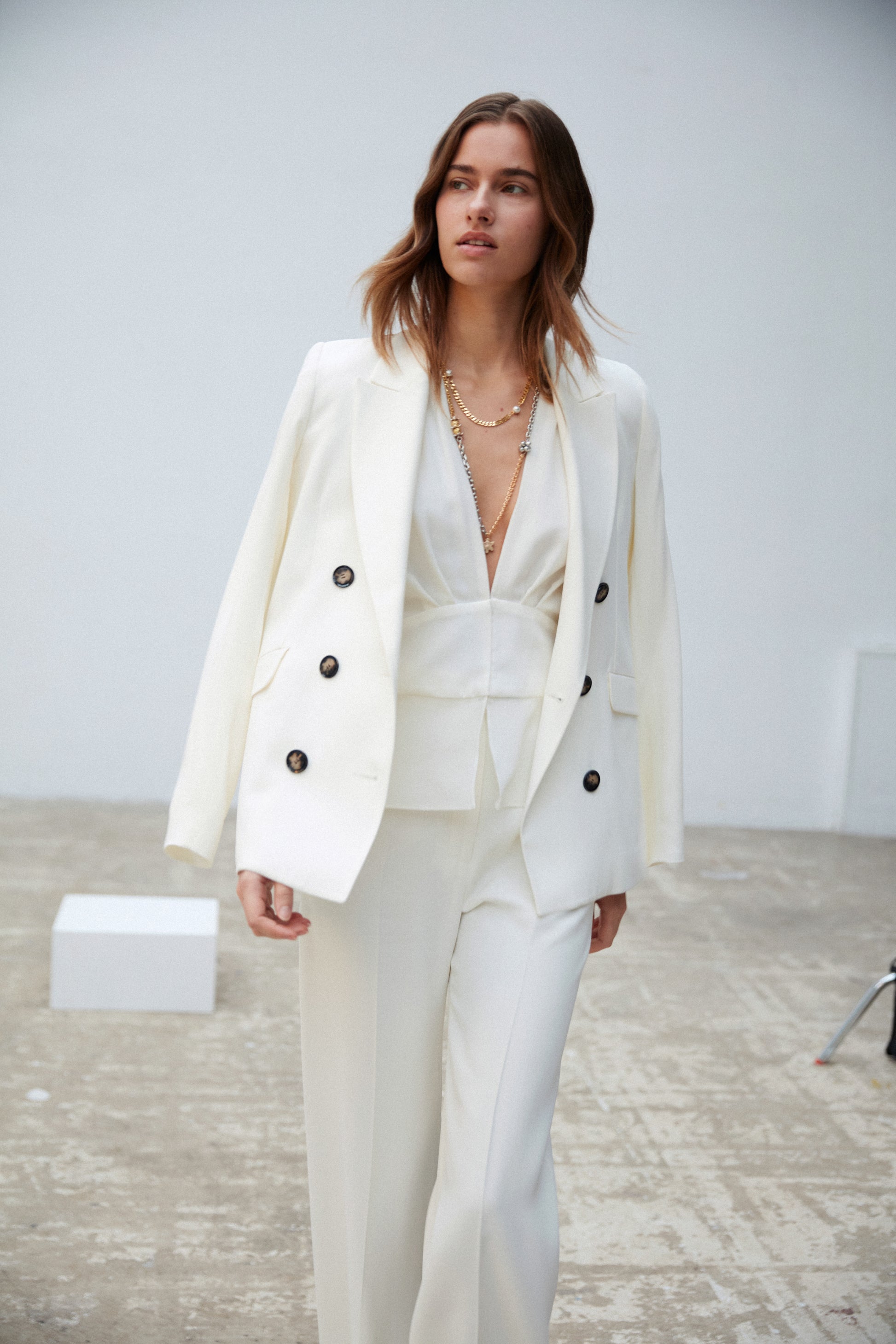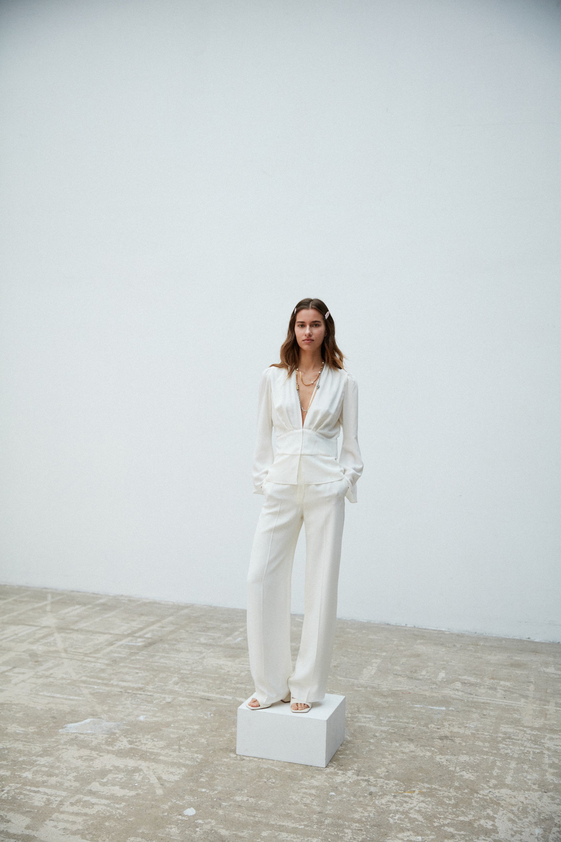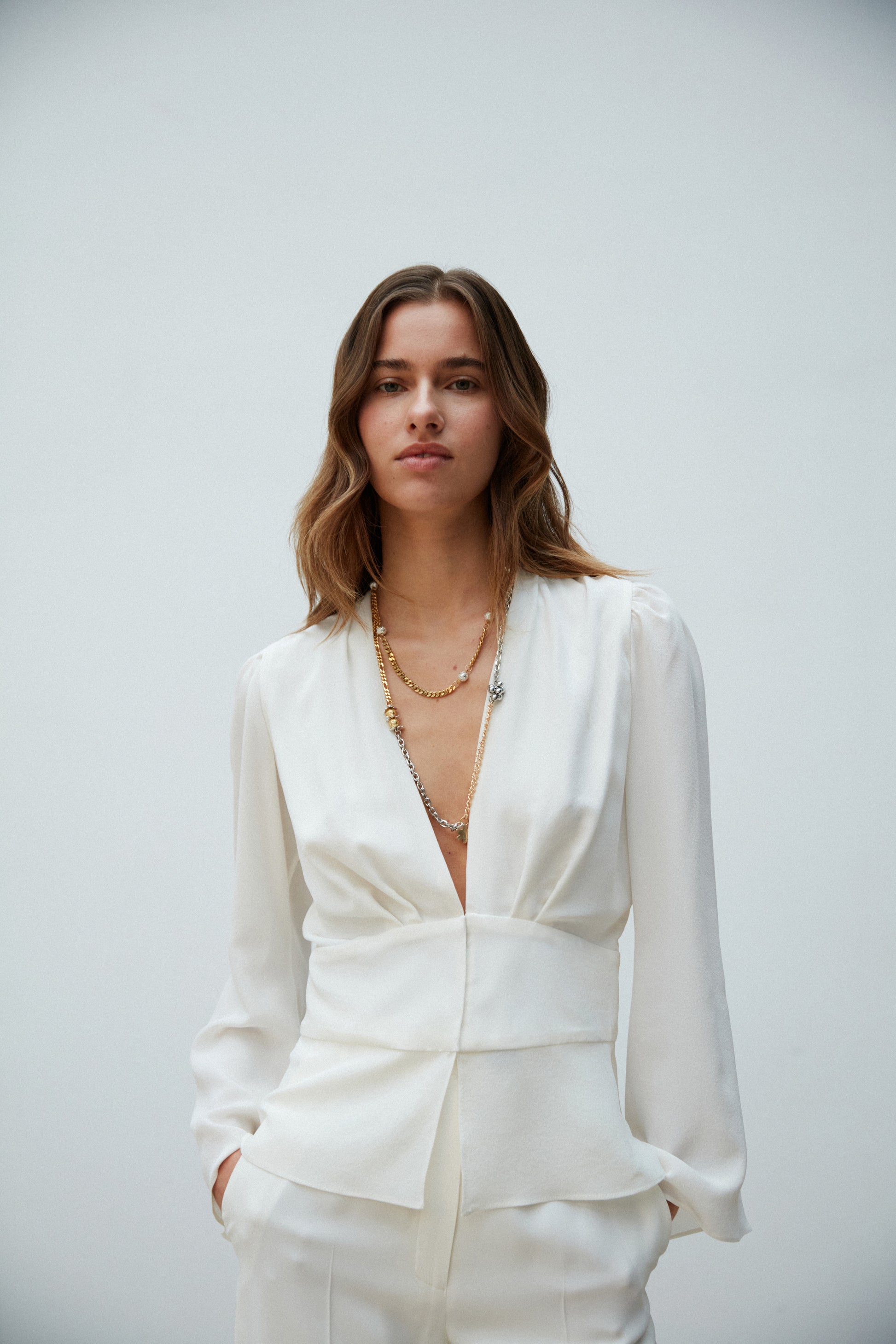 Chemisier manches longues évasées sur le bas, col V plongeant, taille cintrée avec basque.
