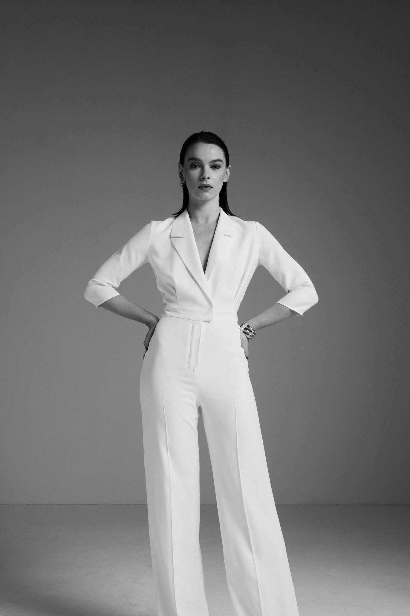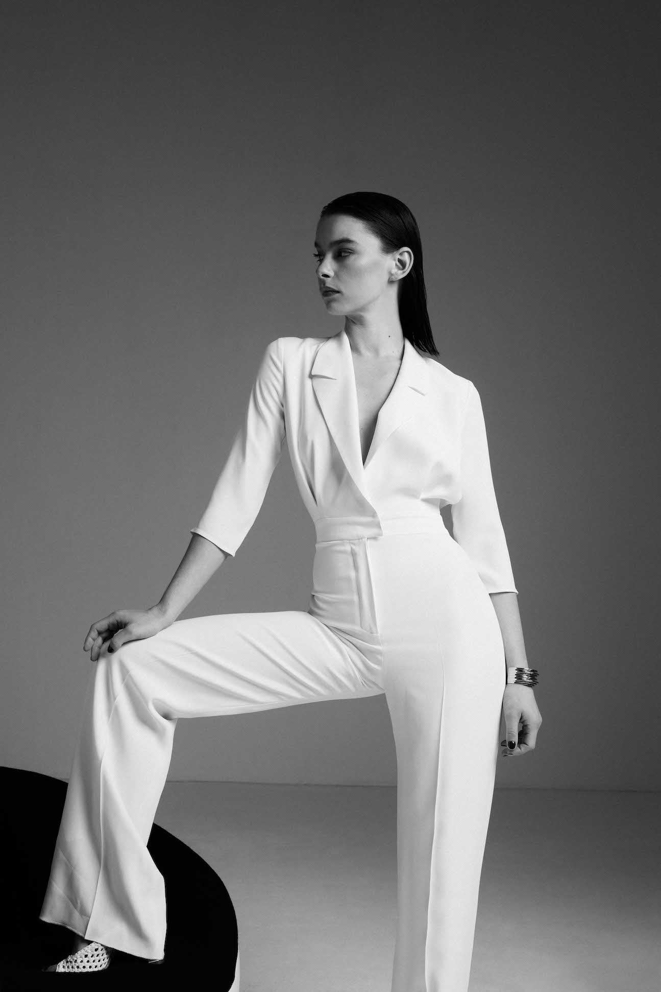Combinaison pantalon à manches 3/4, taille haute, col tailleur.