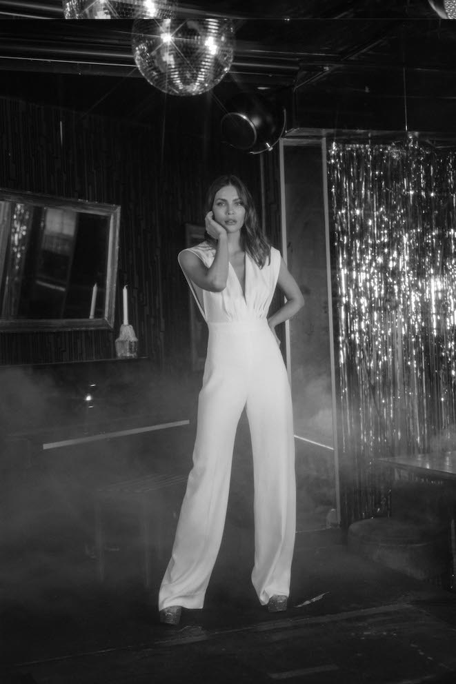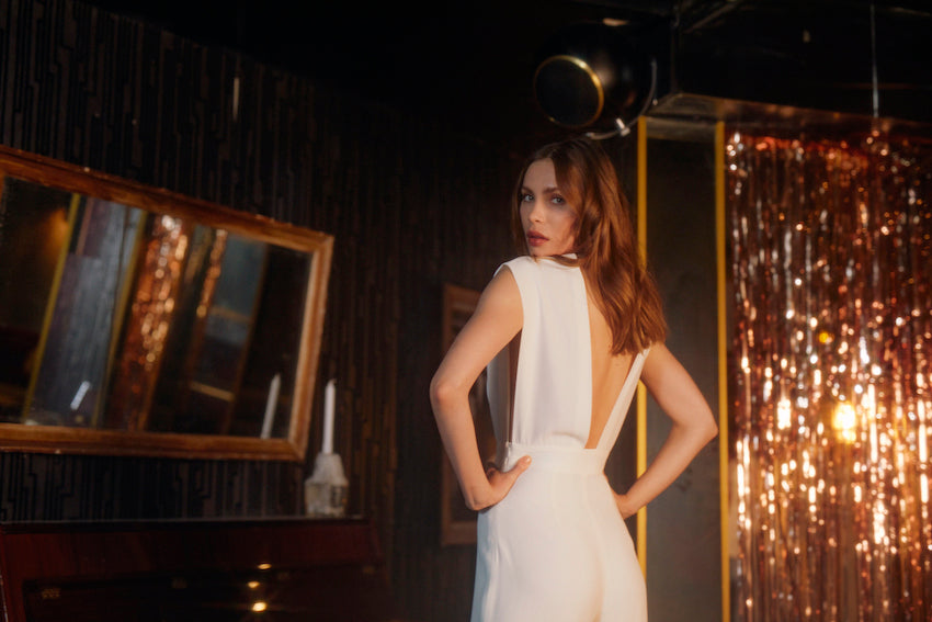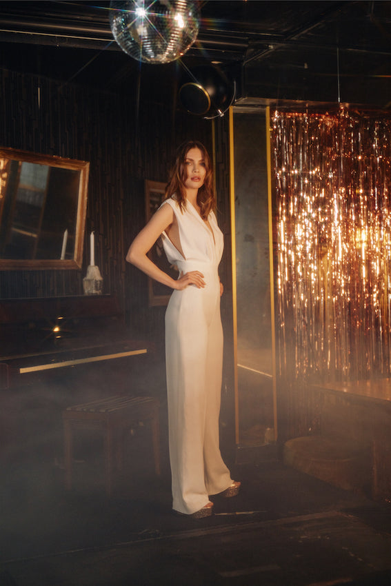 Combinaison pantalon très taille haute sans manches. Décolleté V profond devant, côtés ouverts, dos ouvert en U. Un petit lien relie les deux épaules pour plus de maintien. Elle est ajustée à la taille et sur les hanches puis large au niveau des jambes.