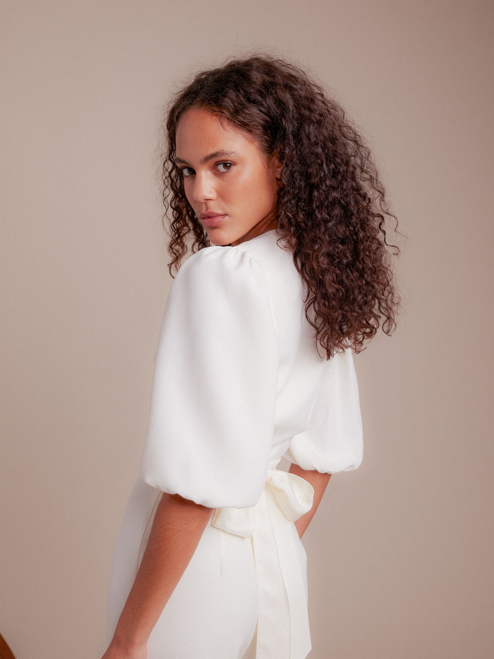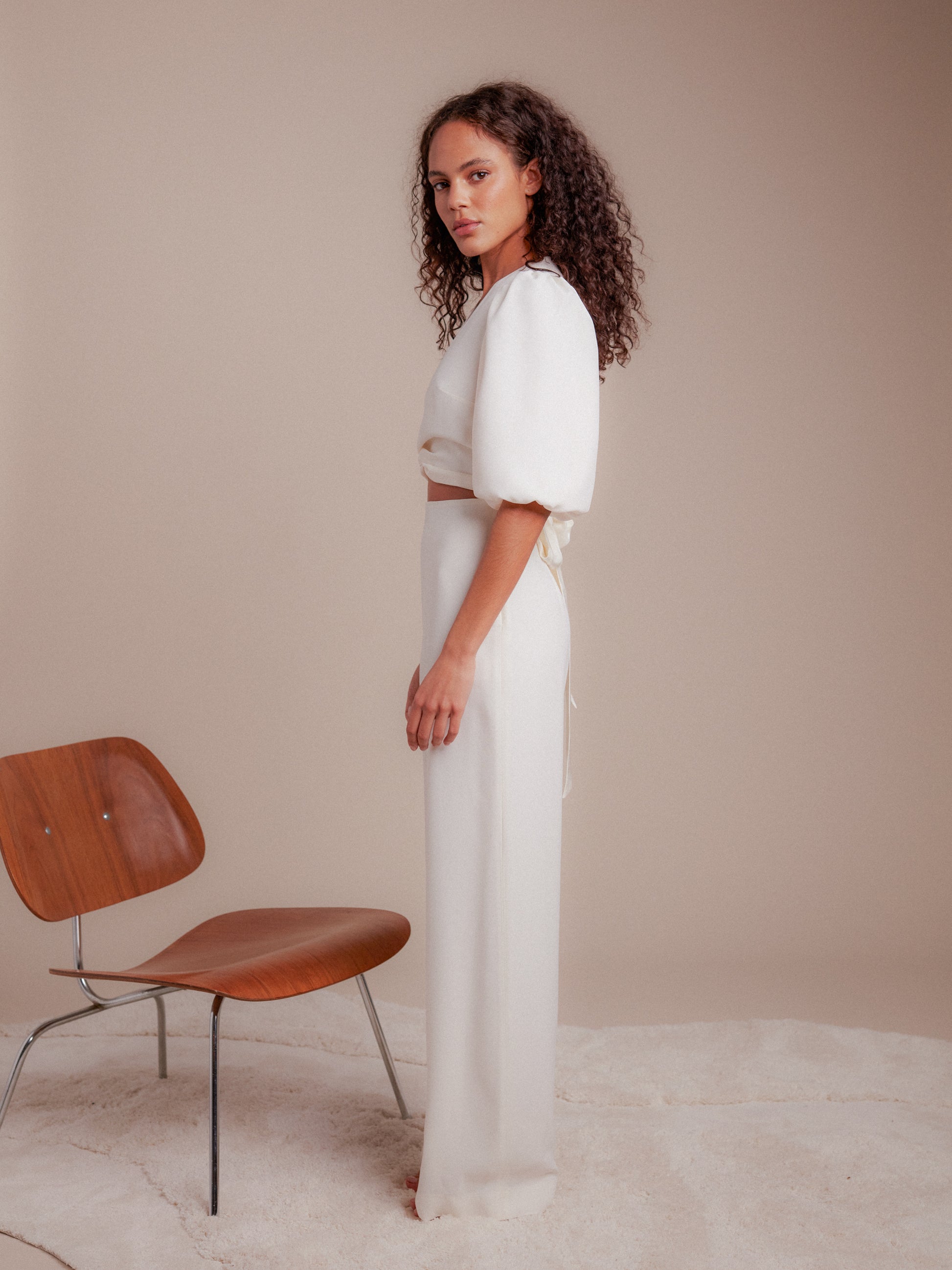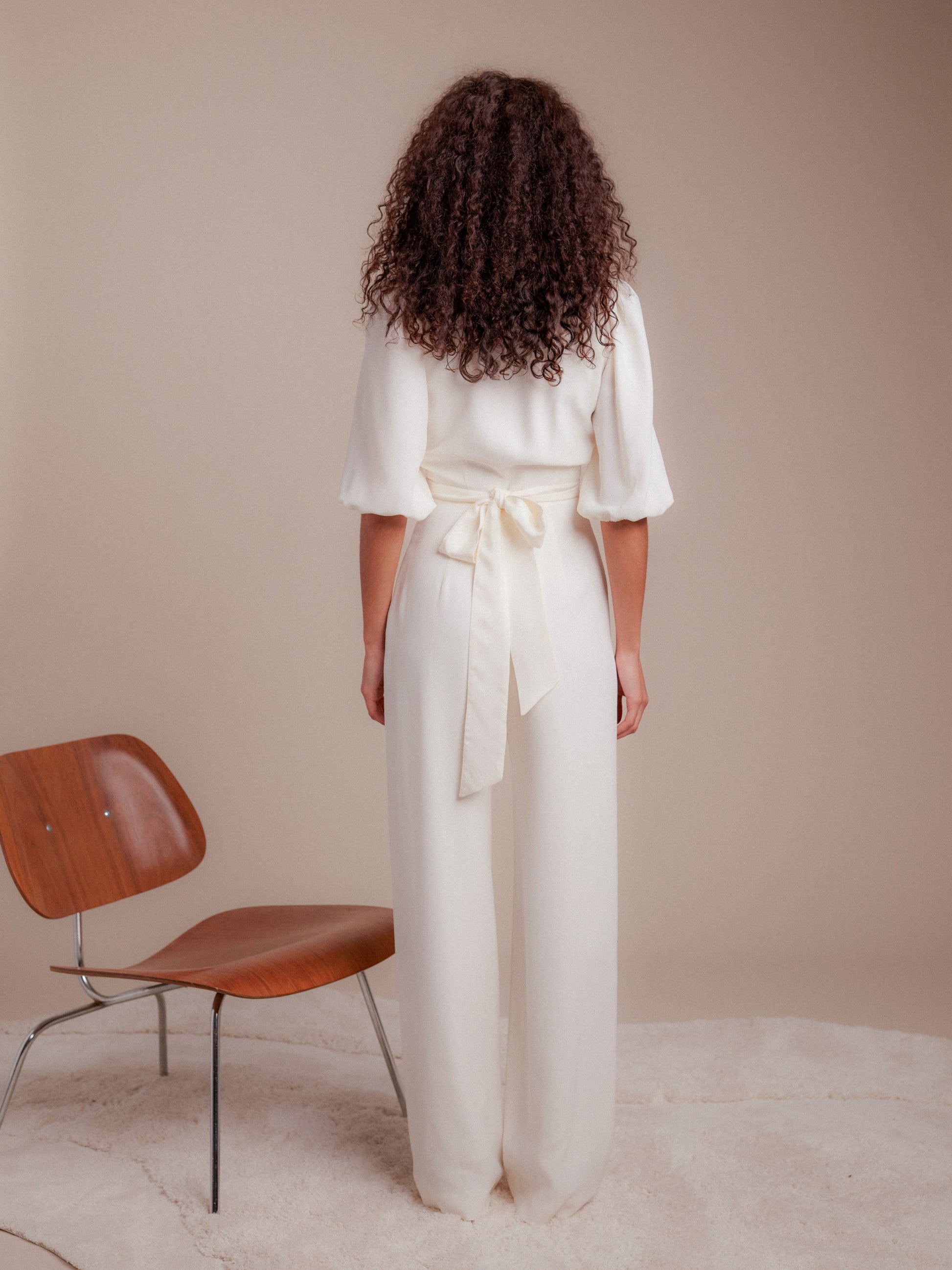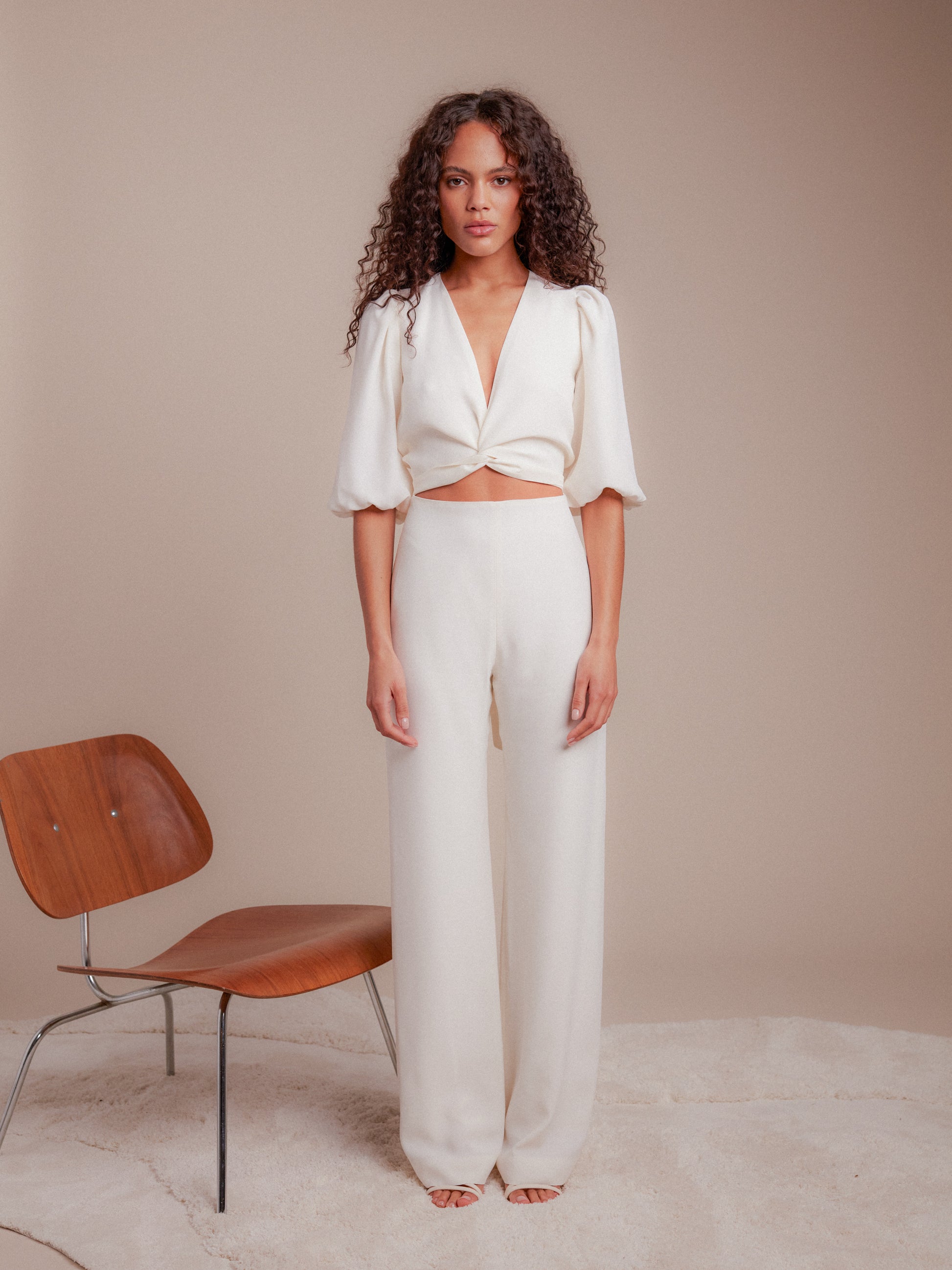 Cache-coeur ou torsadée devant, à nouer dans le dos. Pantalon ajusté au niveau de la taille et des hanches puis jambes larges.