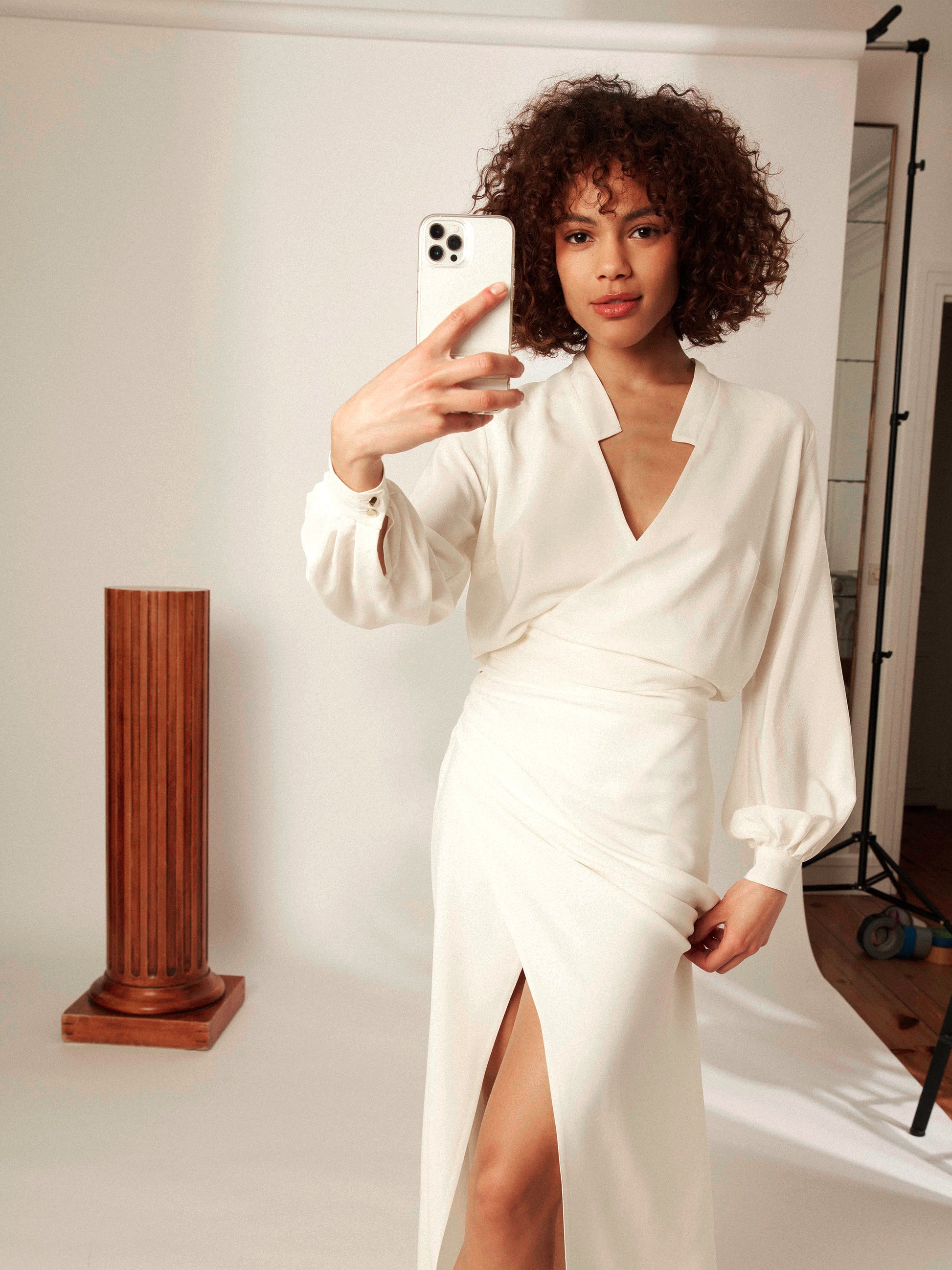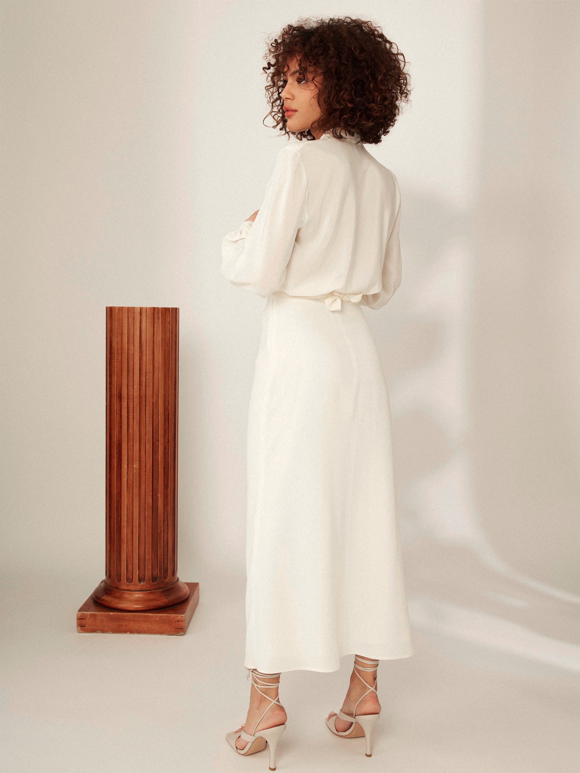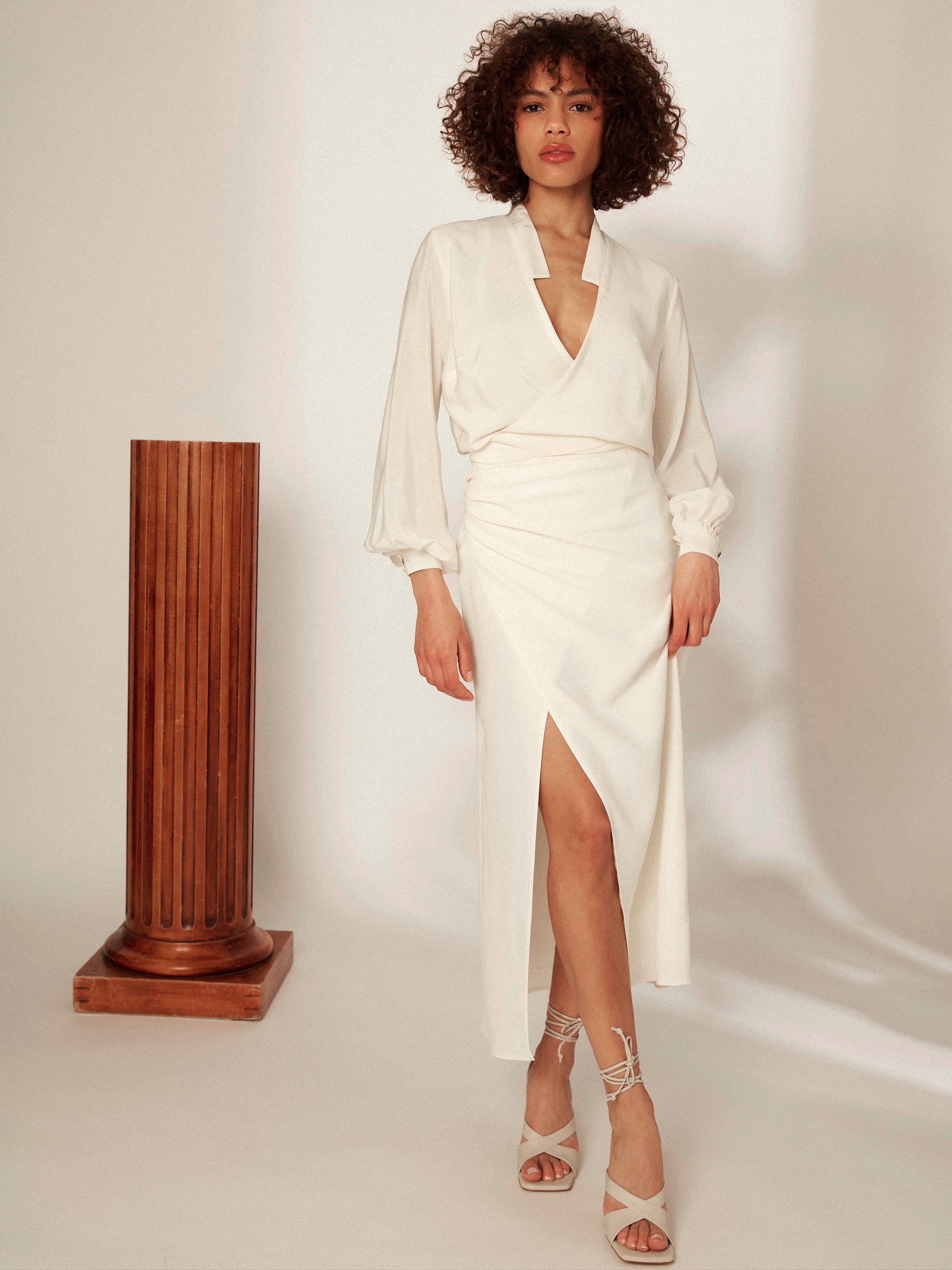 Jupe longueur mi-mollet, drapée effet porte-feuille. Zip invisible côté gauche.