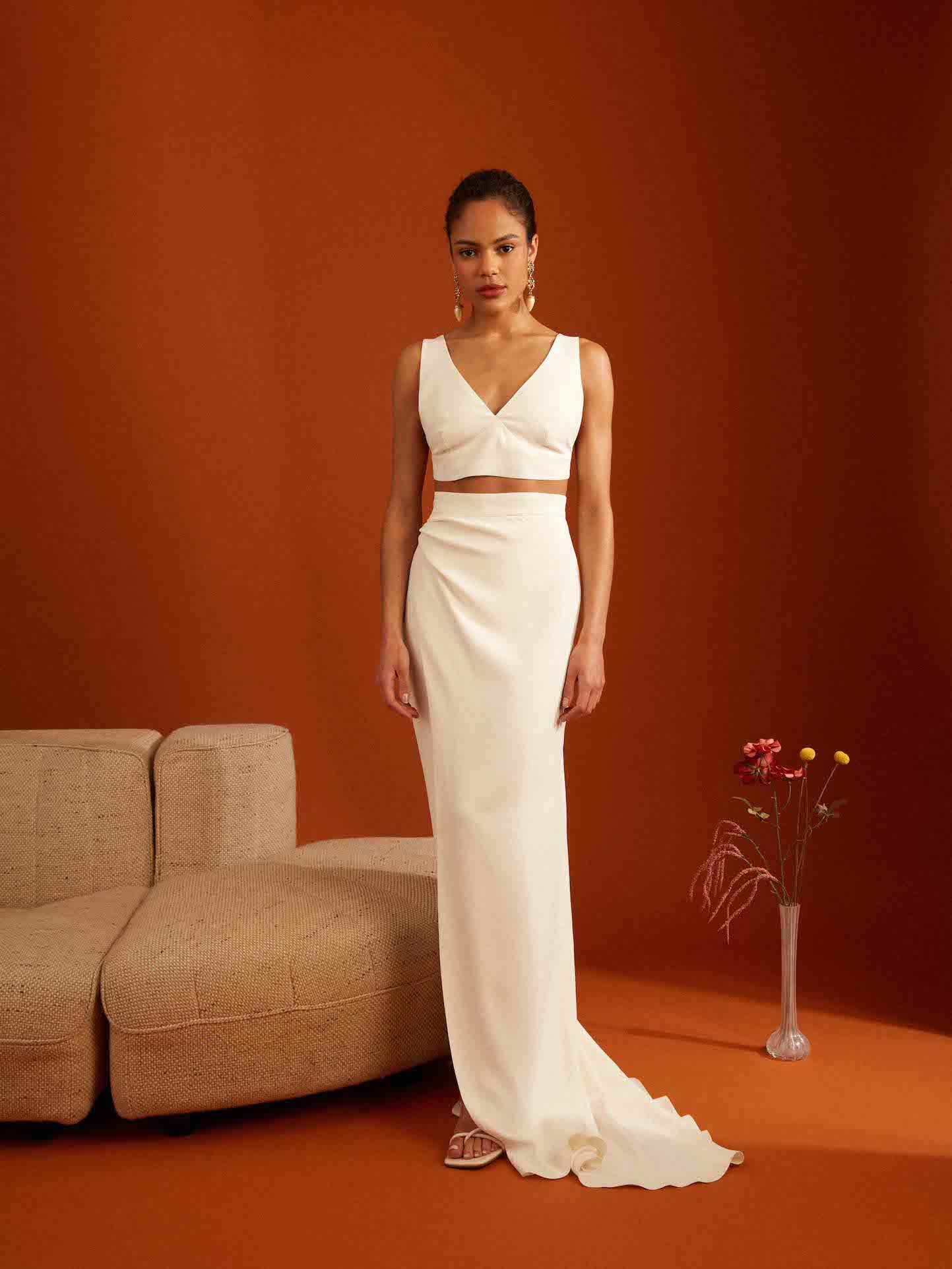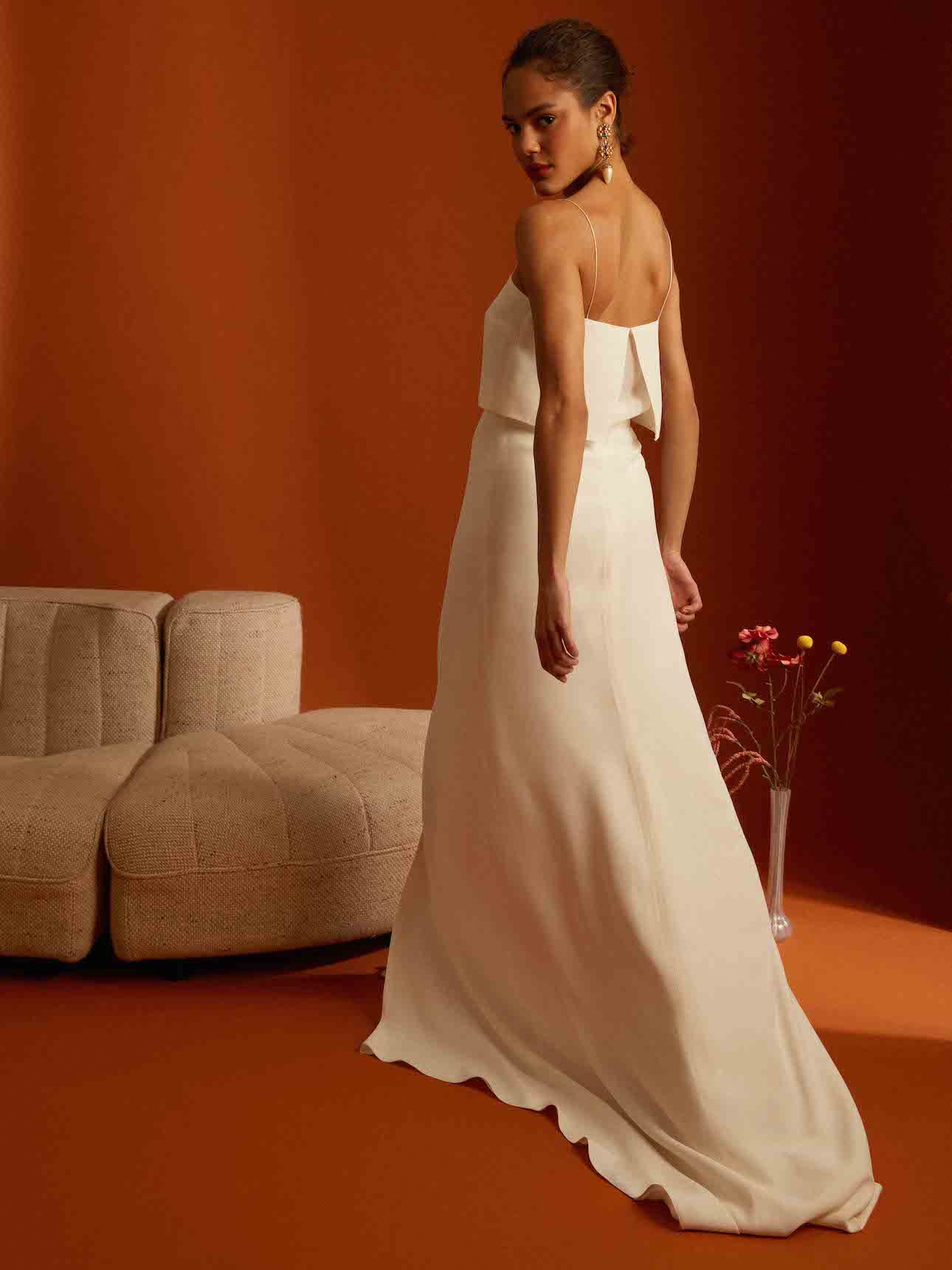 Jupe longue, drapée effet porte-feuille. Zip invisible côté gauche.