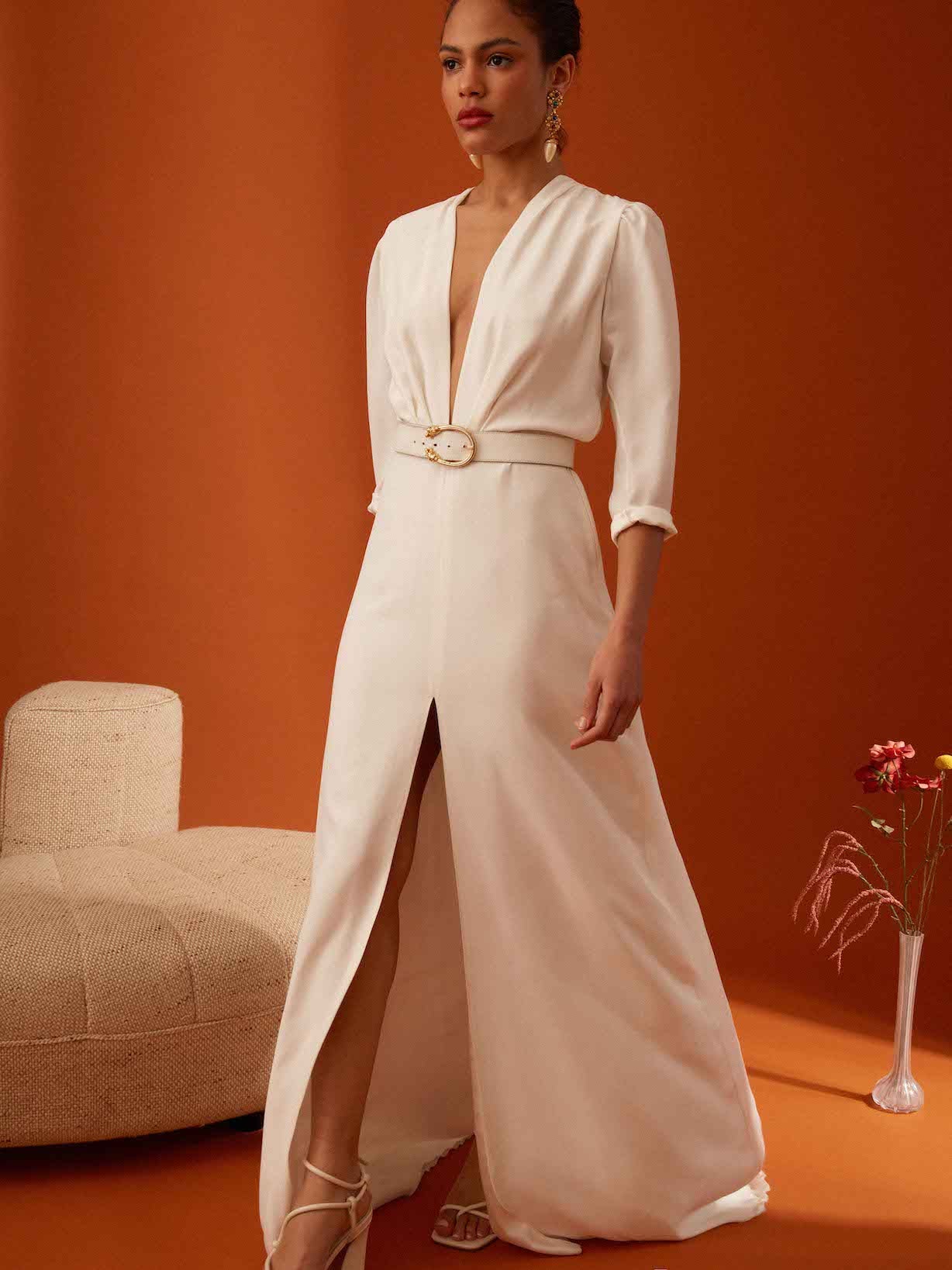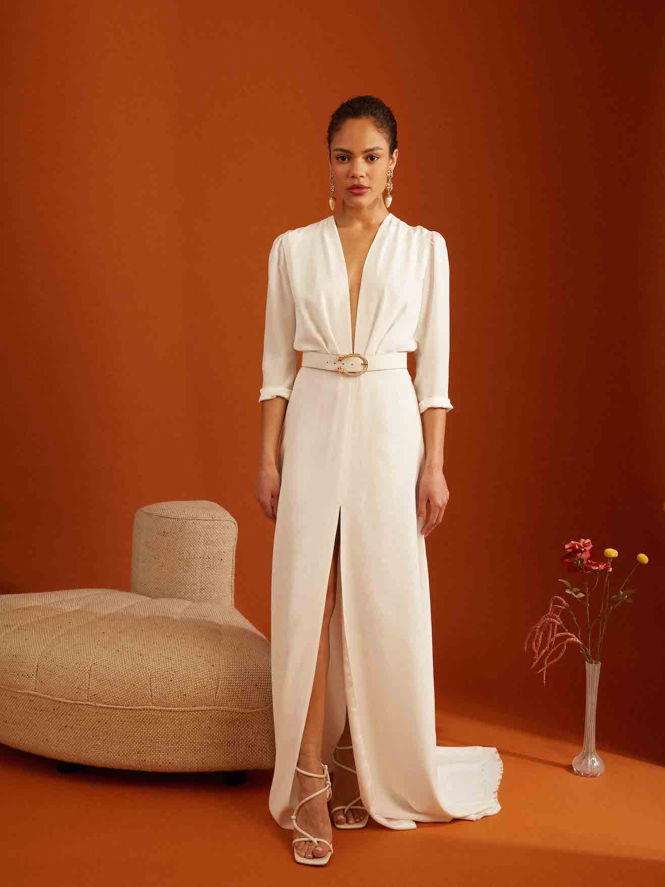 Robe longue fluide, décolleté V profond devant. Jupe fendu au milieu. Manches gigots.