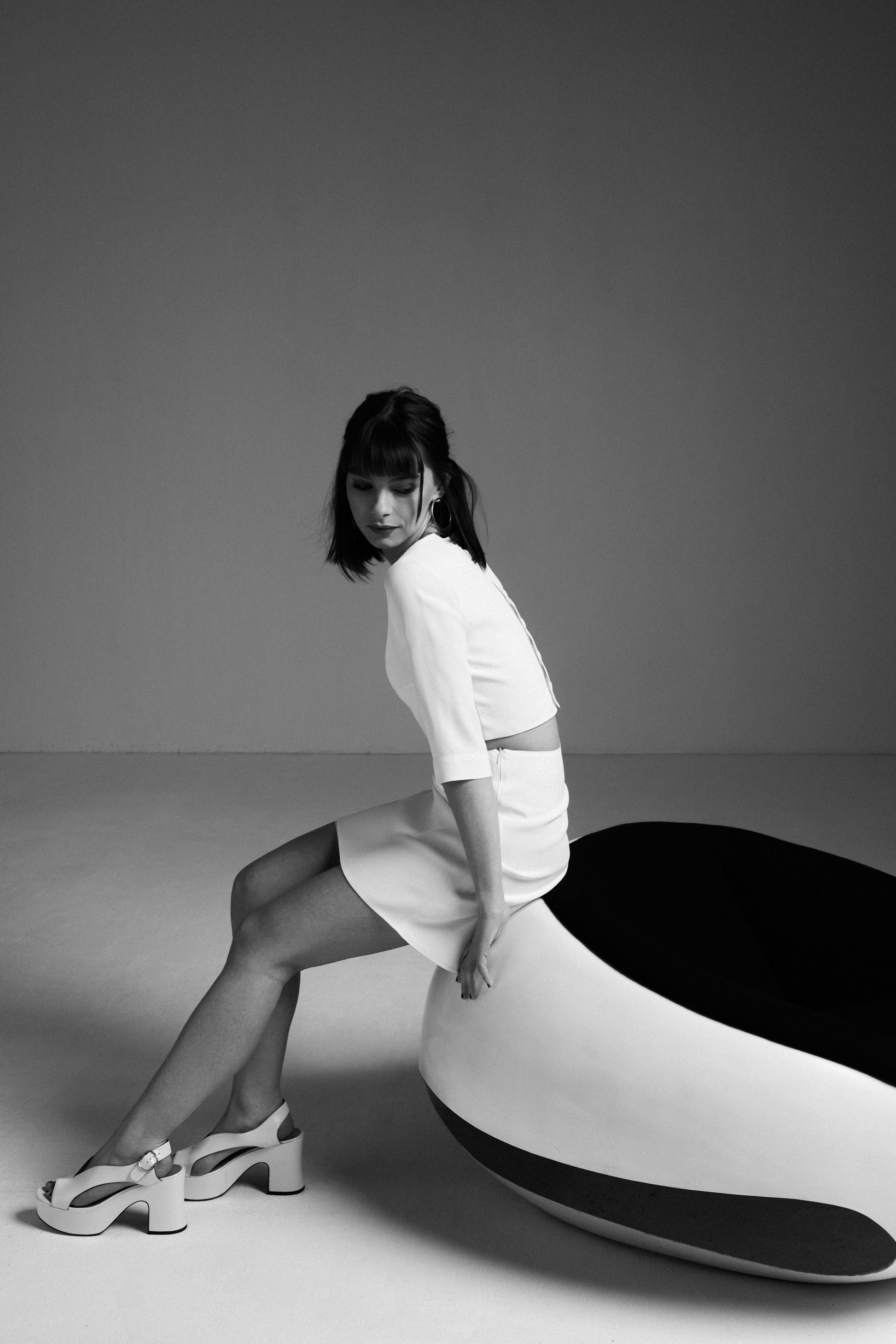 Encolure V style bateau devant. Jupe trapèze zip côté invisible.