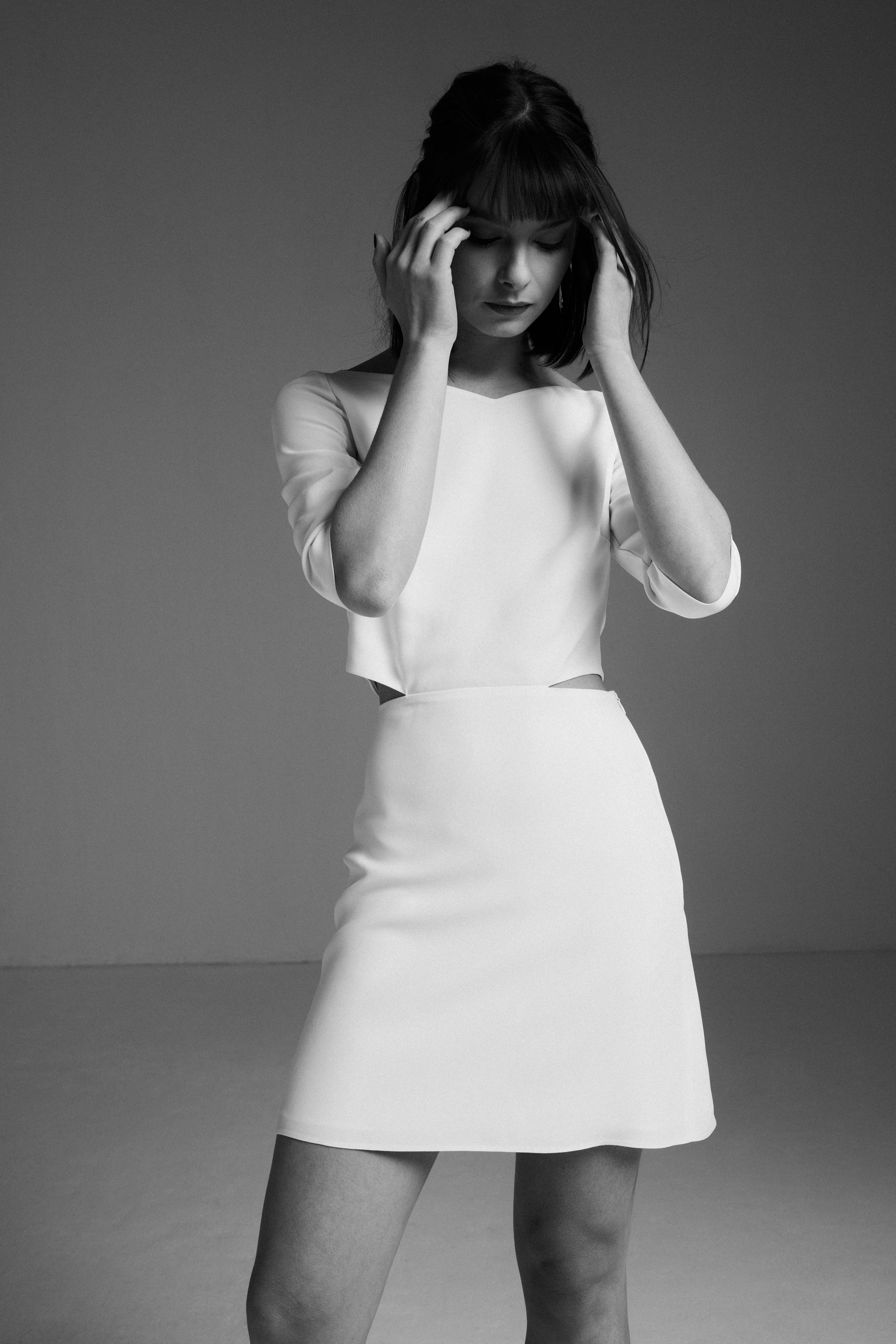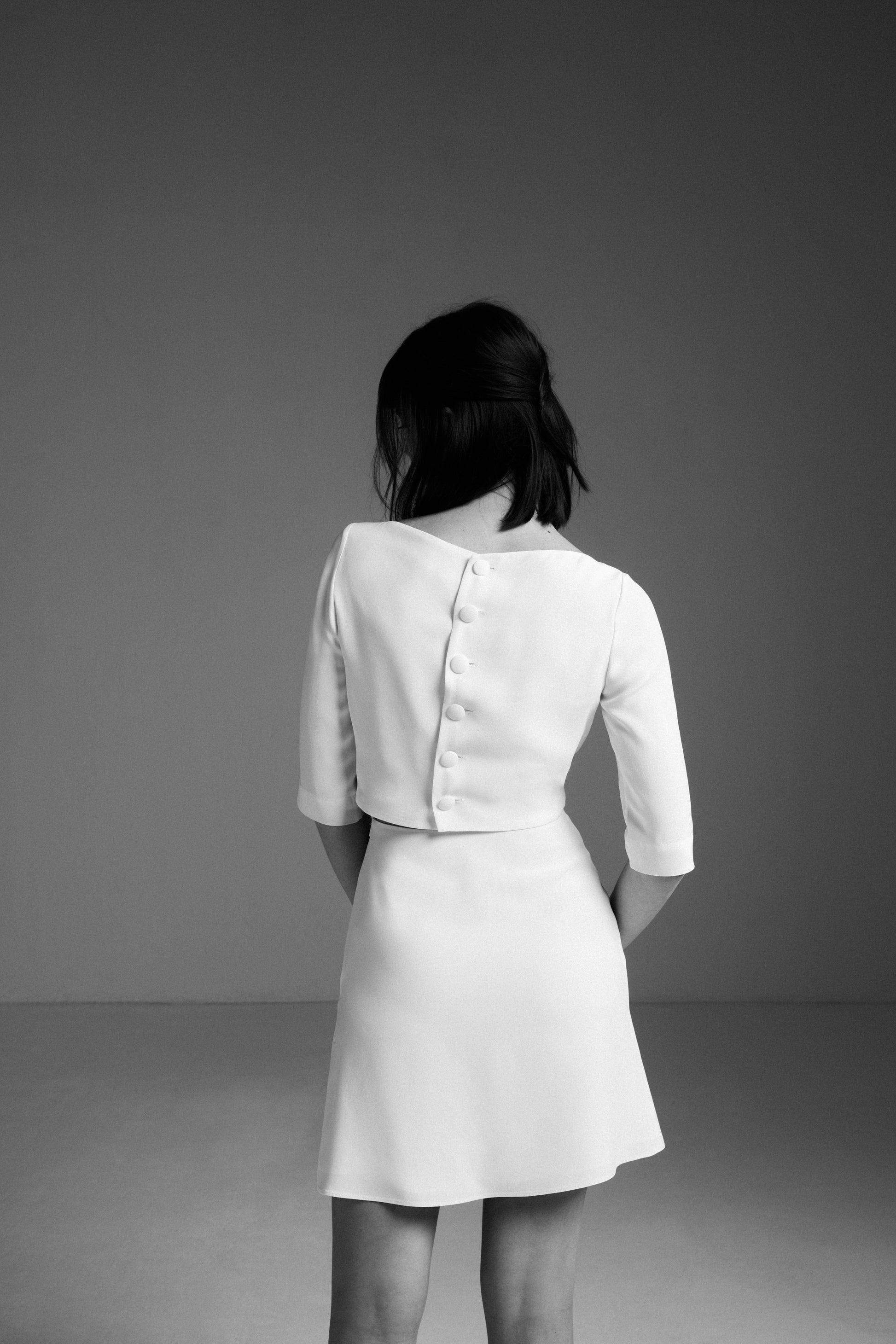 Robe courte, longueur mi cuisse, fermeture dos boutonnées, boutons tissu recouverts. Ouverture au niveau de la taille sur les côtés et dos.