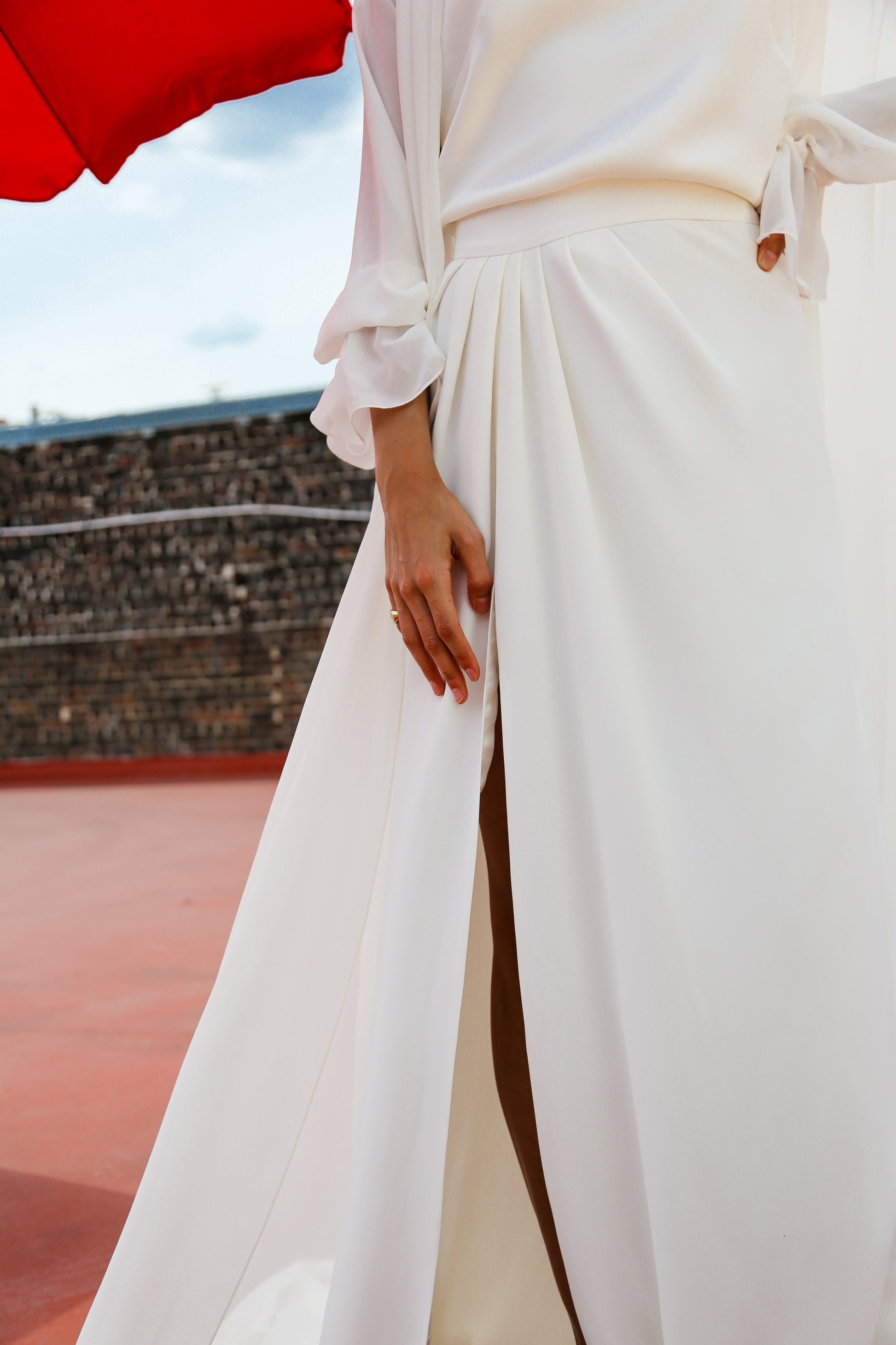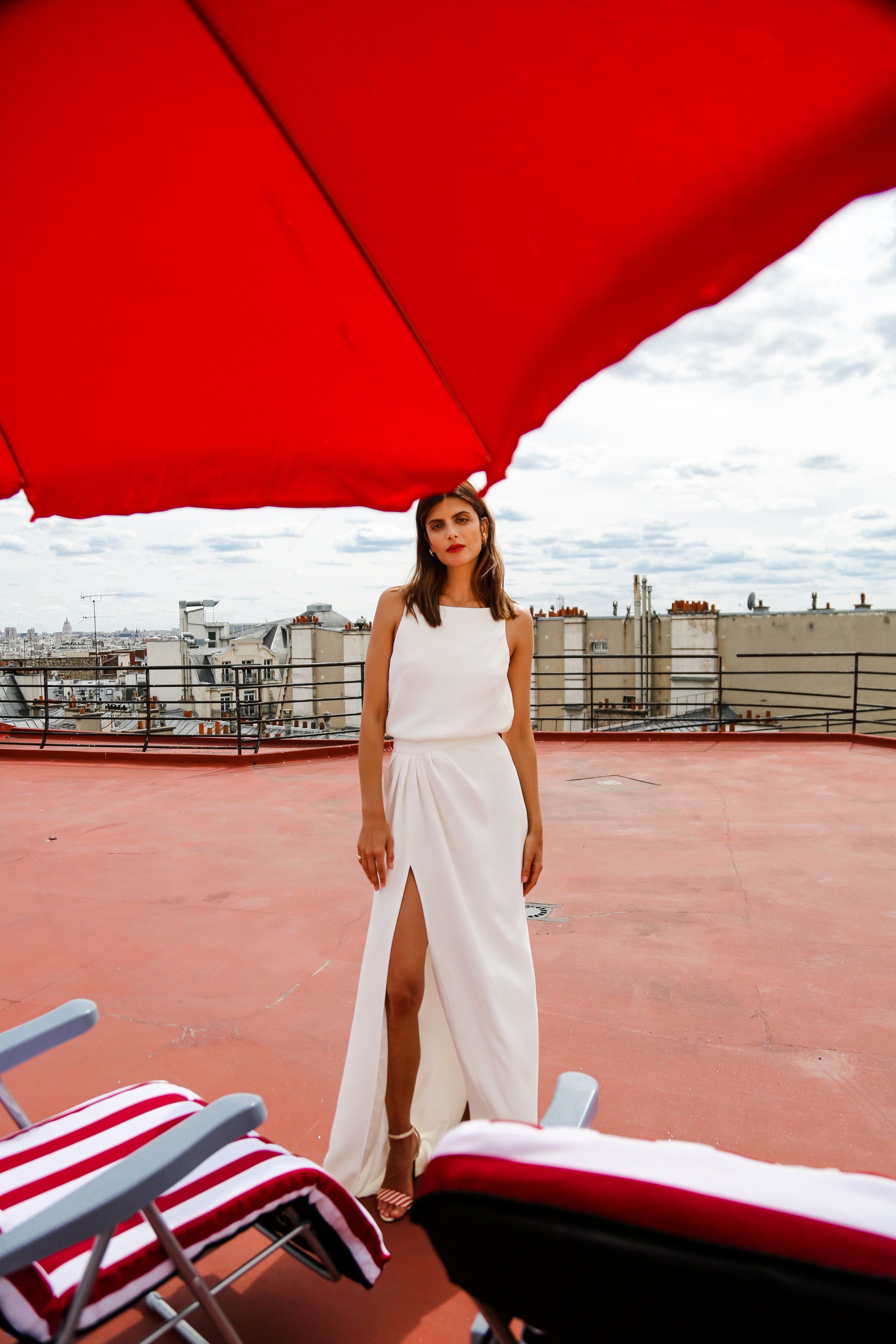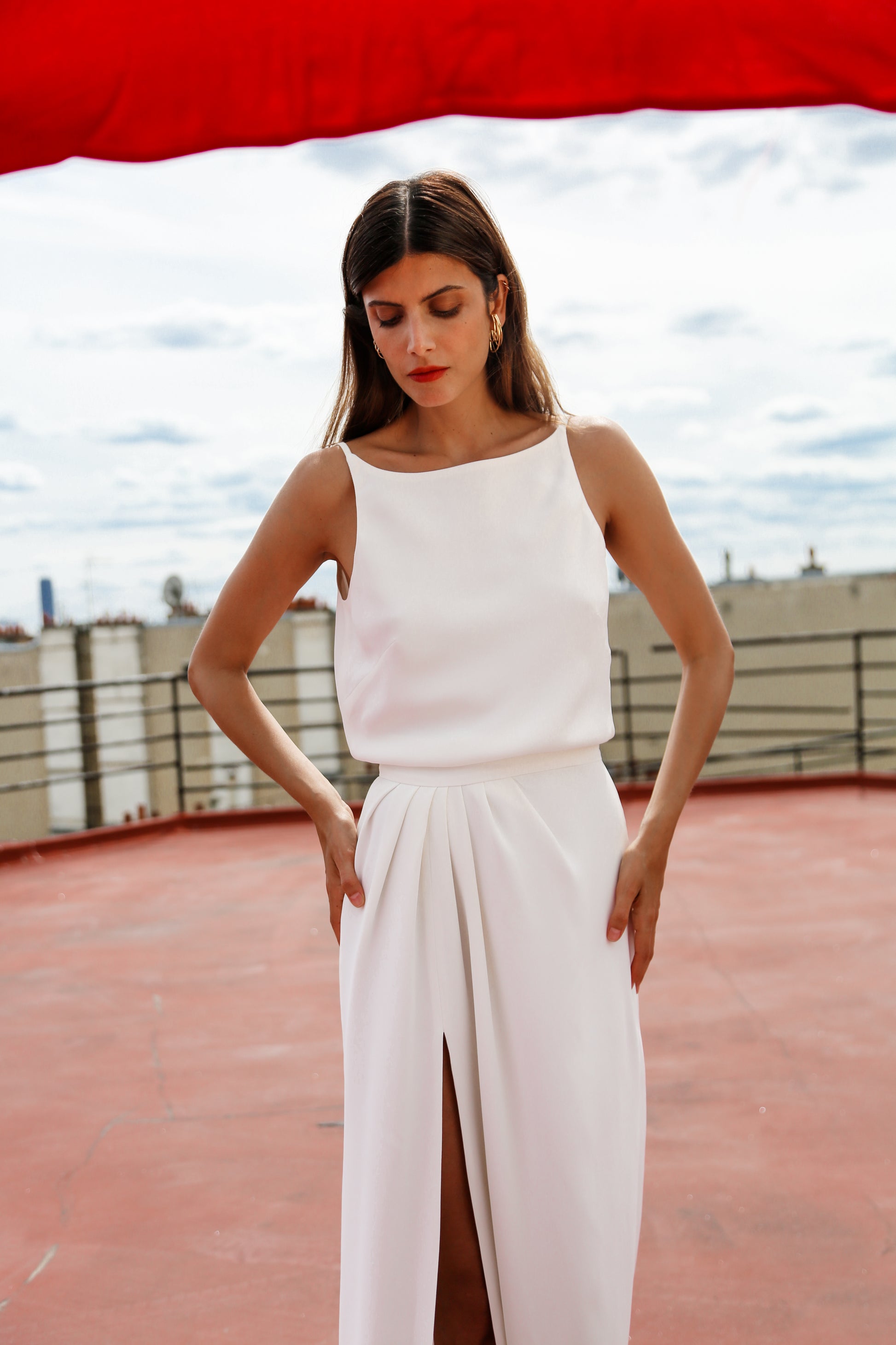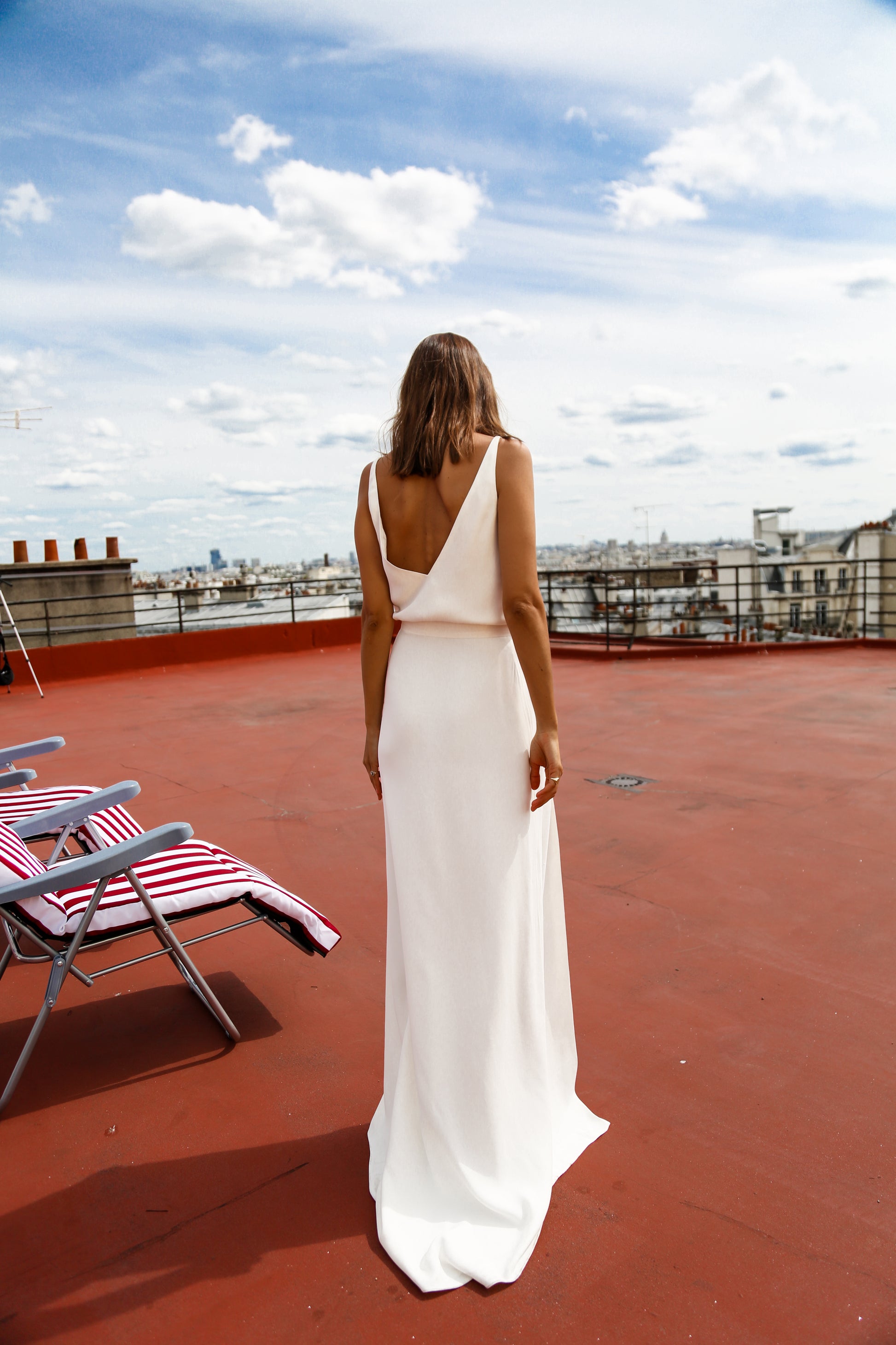 Robe longue, encolure bateau, bretelles fines. Haut légèrement blousant, Dos nu plongeant en V. Jupe drapée fendue à droite.