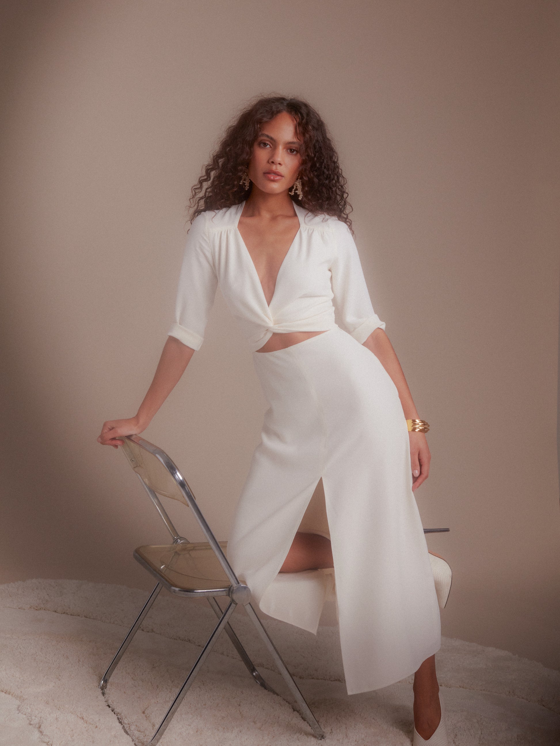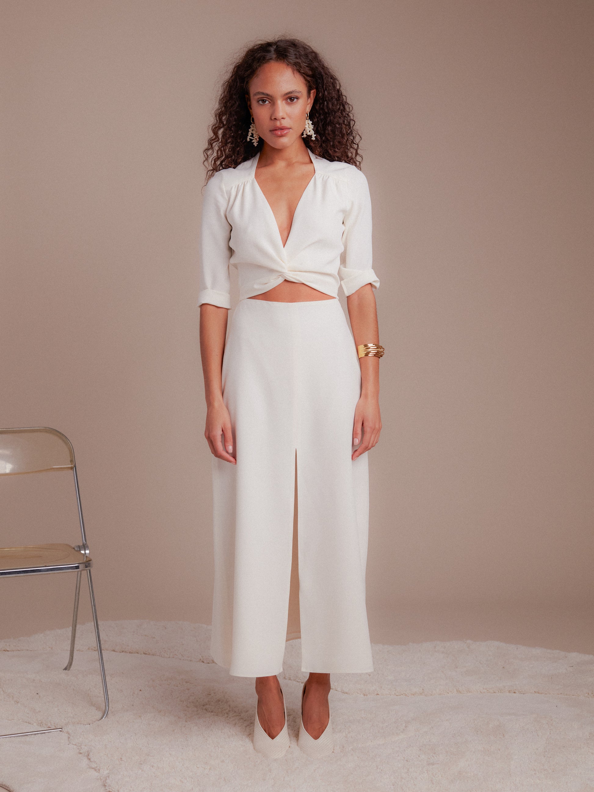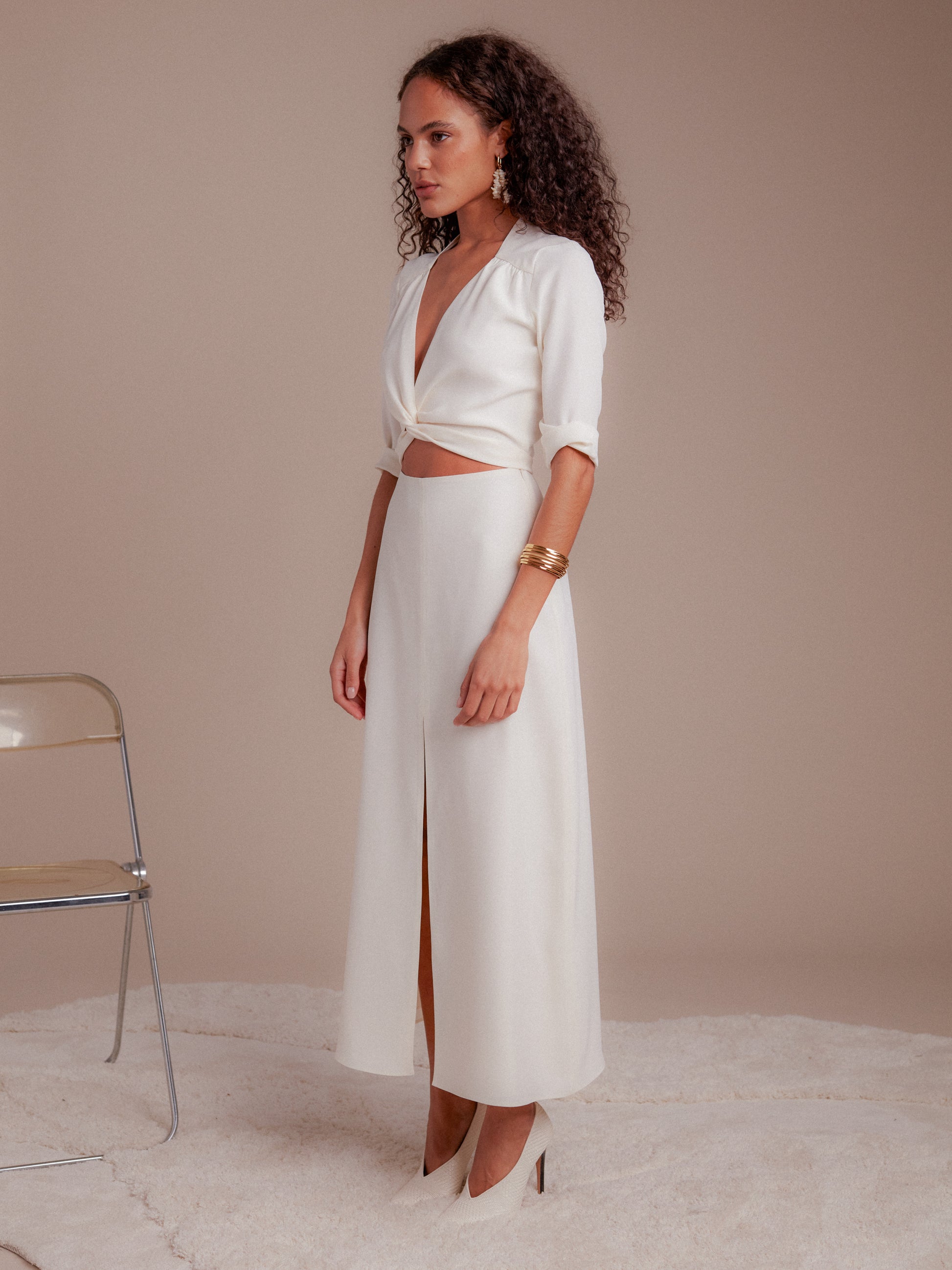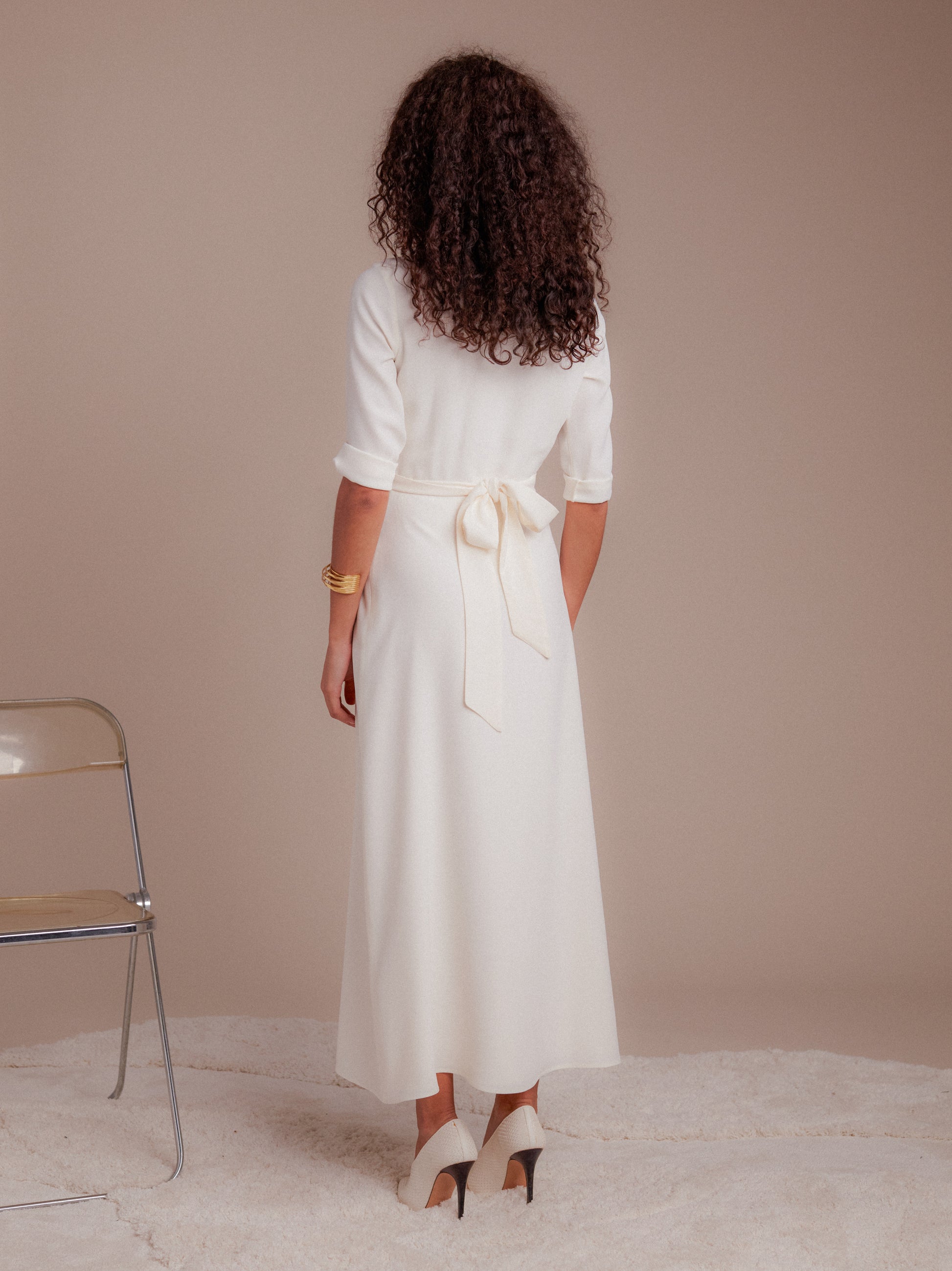 Robe mi longue, manches trois quart. Cache-coeur ou torsadée devant à nouer dans le dos. Ouverture sur le ventre, jupe fente milieu devant.