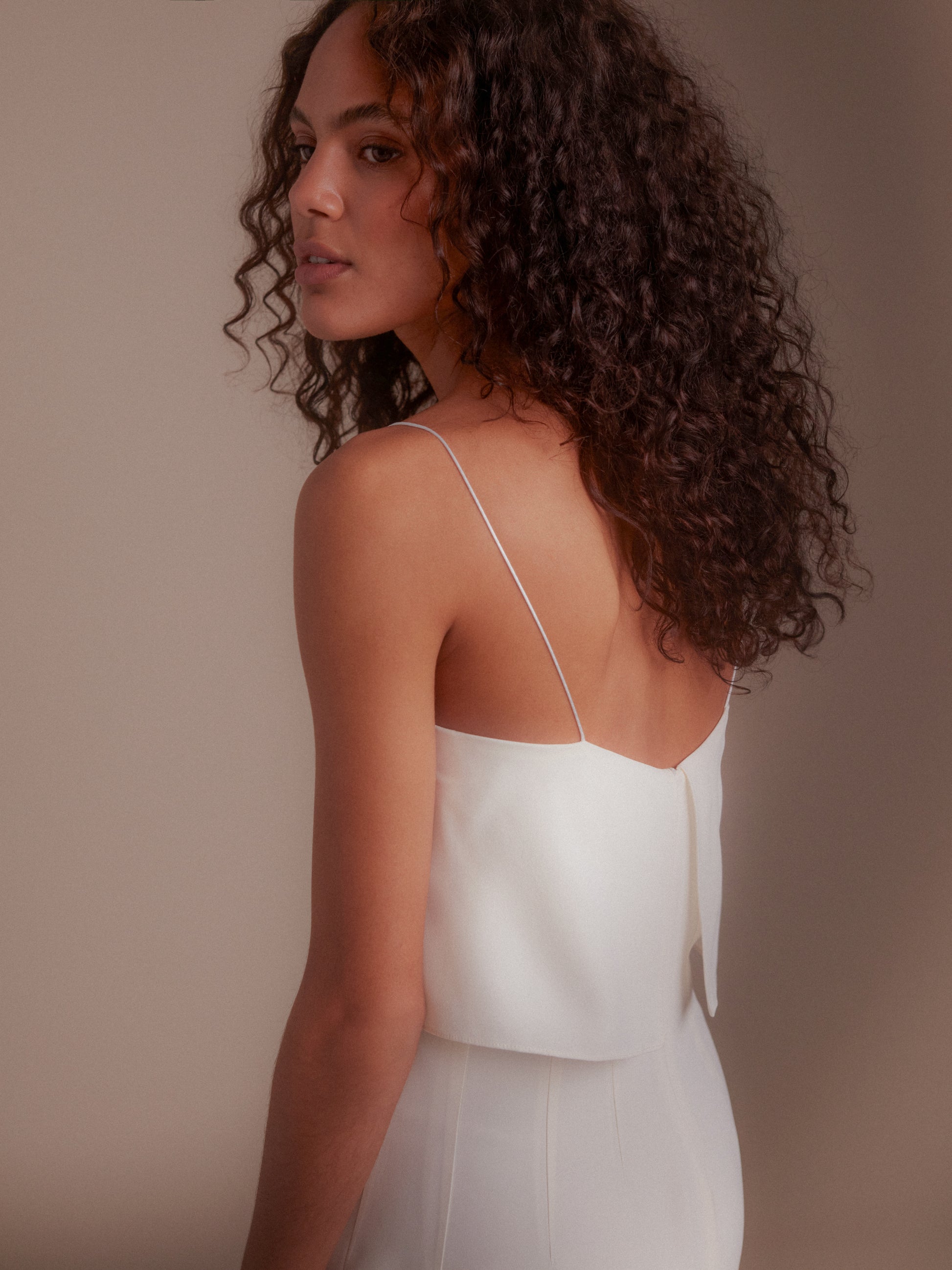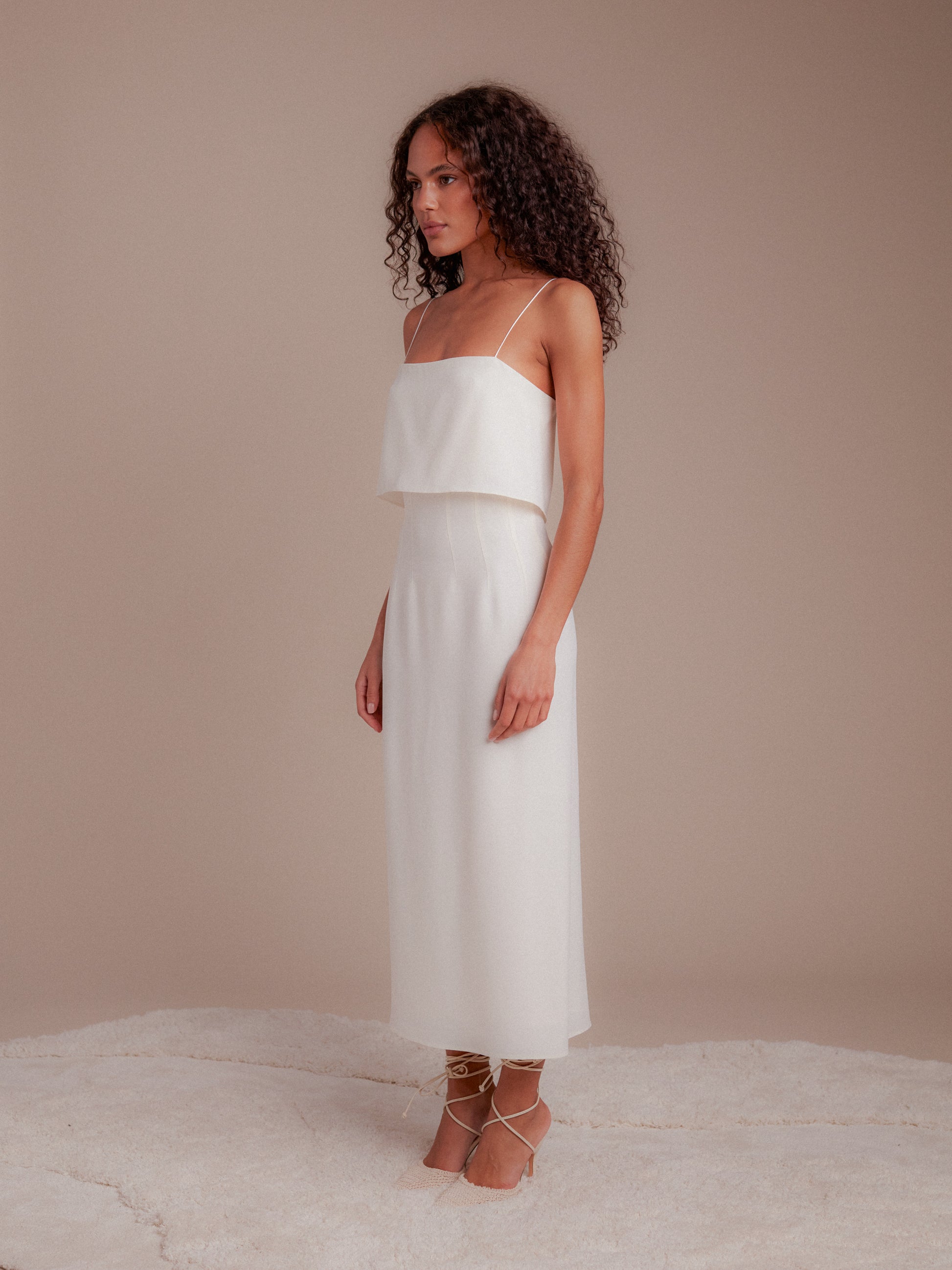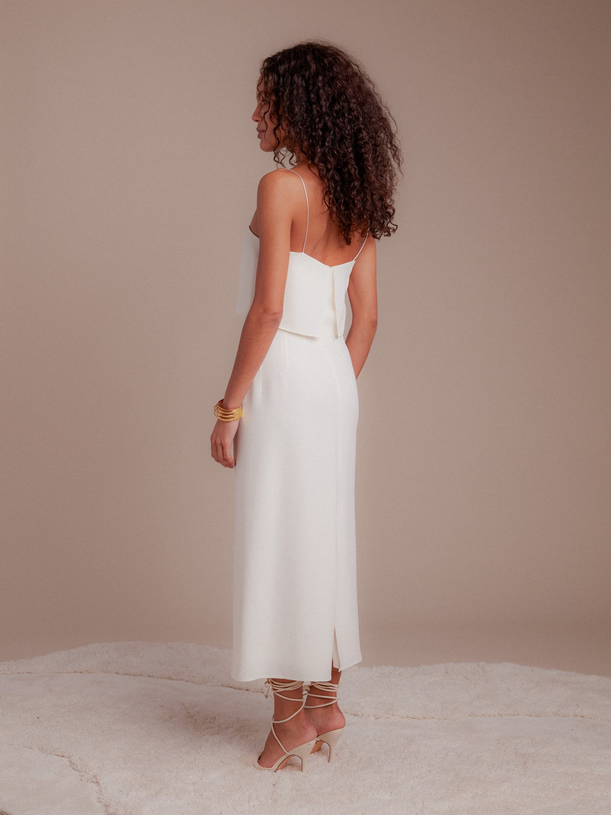 Robe mi longue, col droit, bretelles spaghettis. Fente milieu dos.