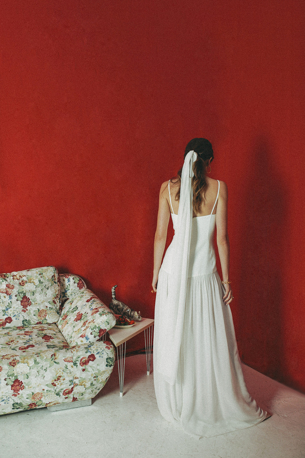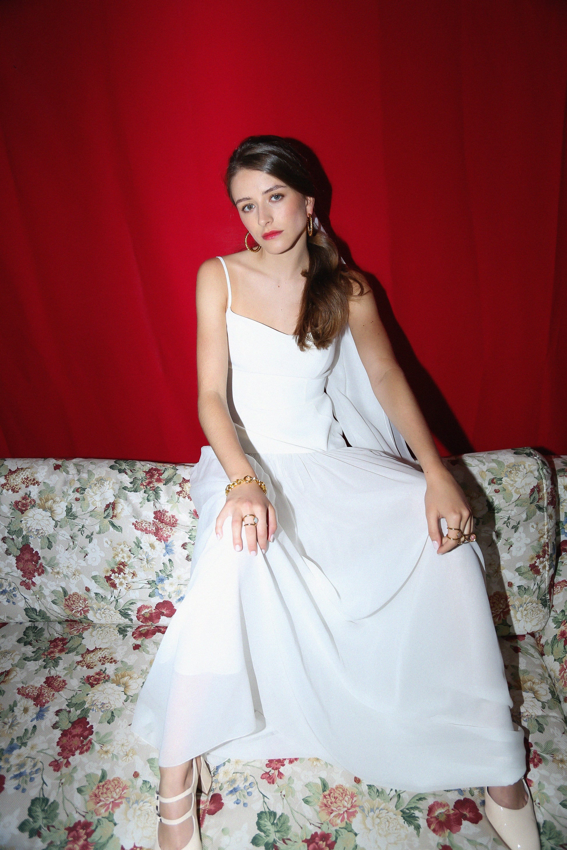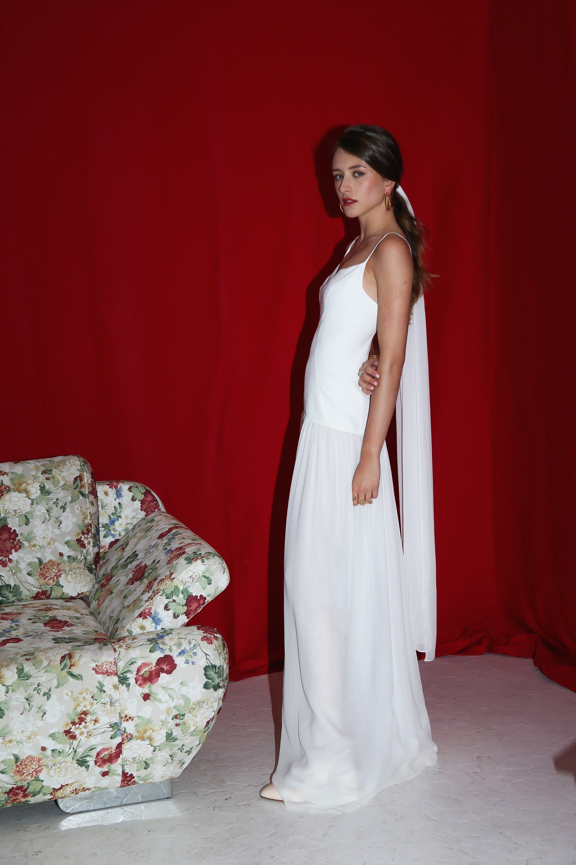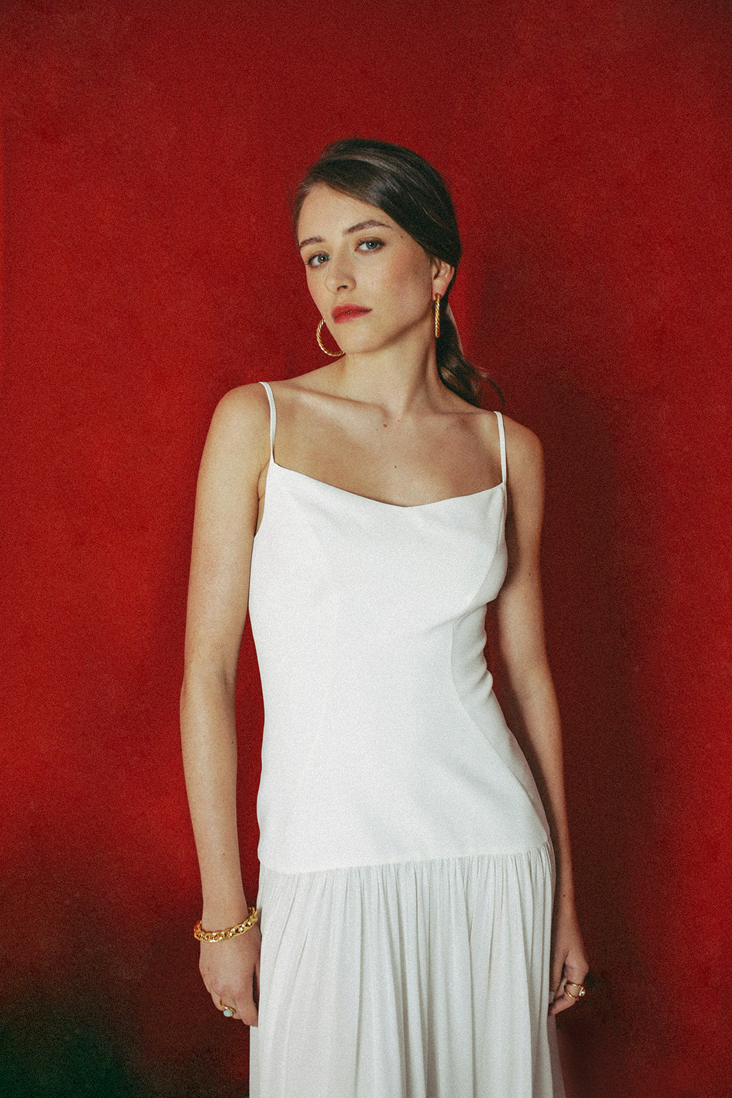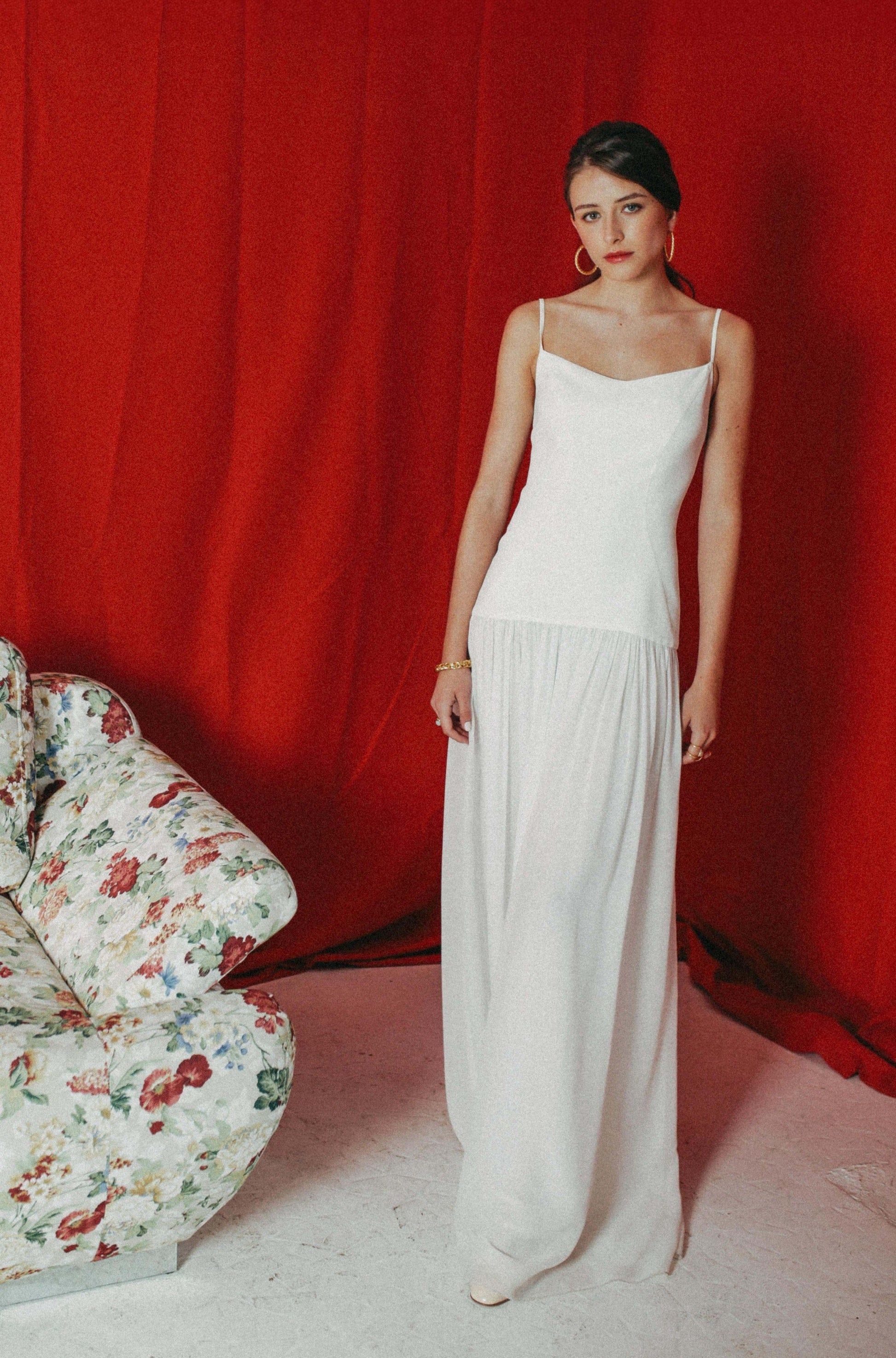 Robe longue couleur blanc ivoire, ajustée près du corps jusqu’à la taille basse, fine bretelle, jupe froncée légèrement transparente.
