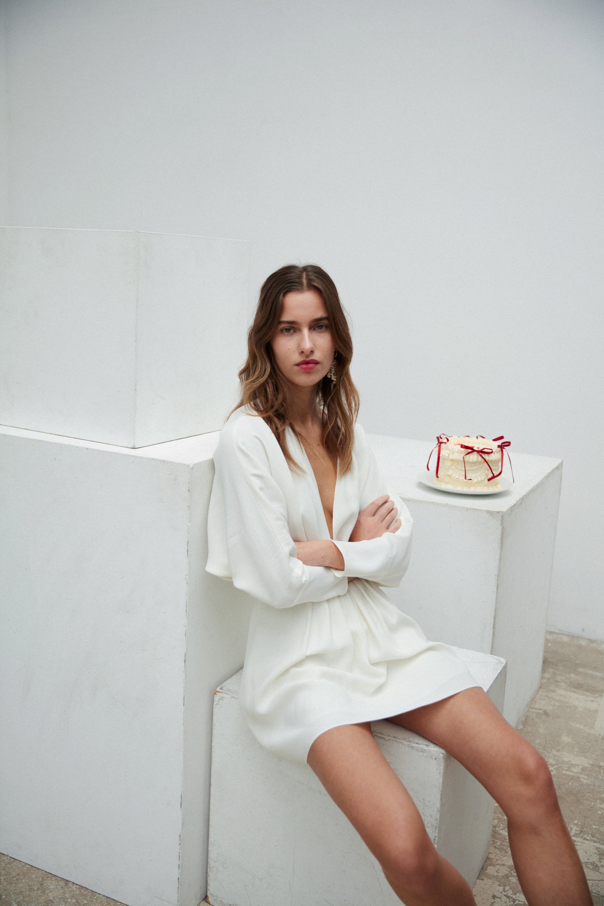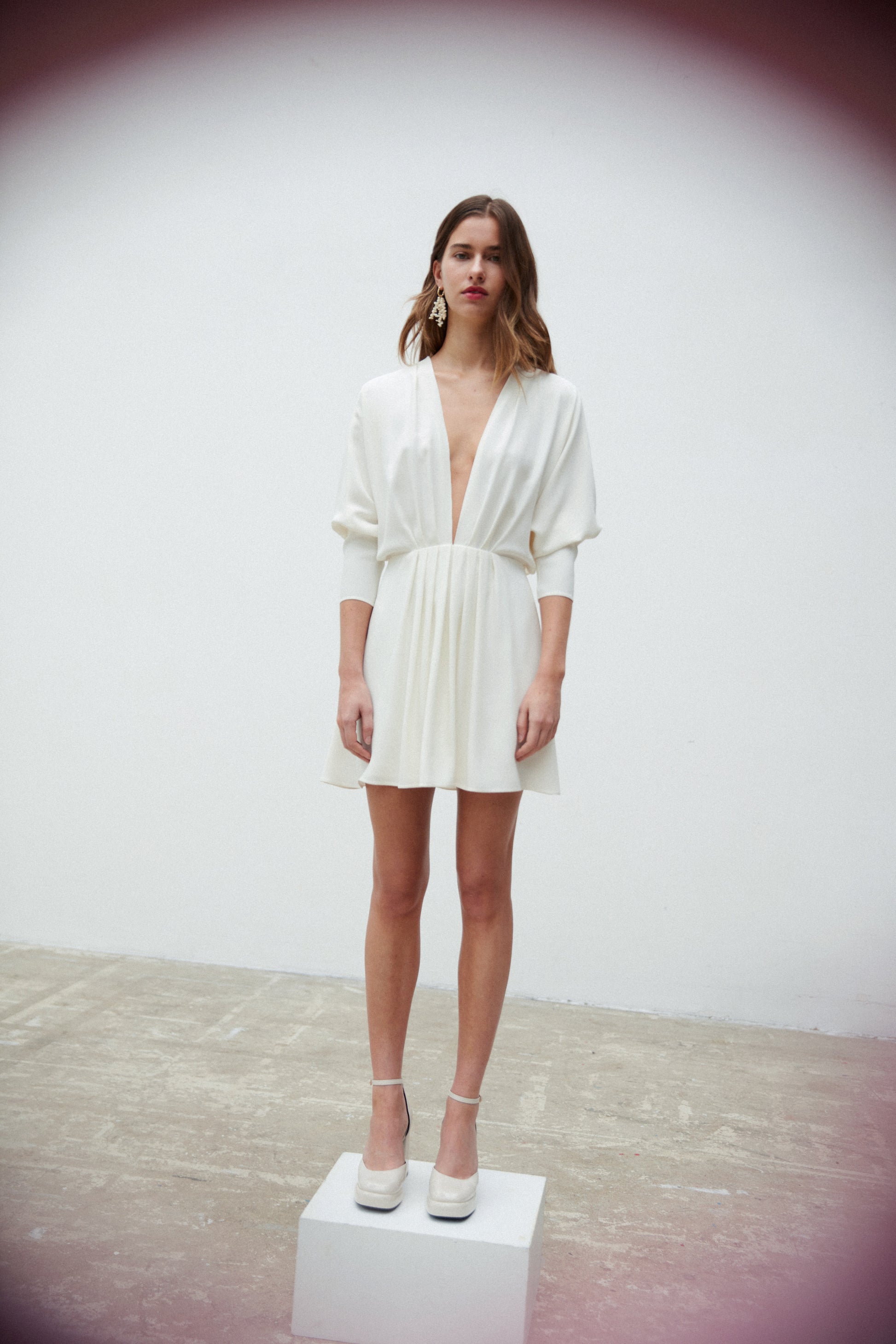 Robe courte. Décolleté V profond devant. Manches longues chauves-souris. Dos nu ouvert en V portefeuille. Jupe patineuse plissé.
