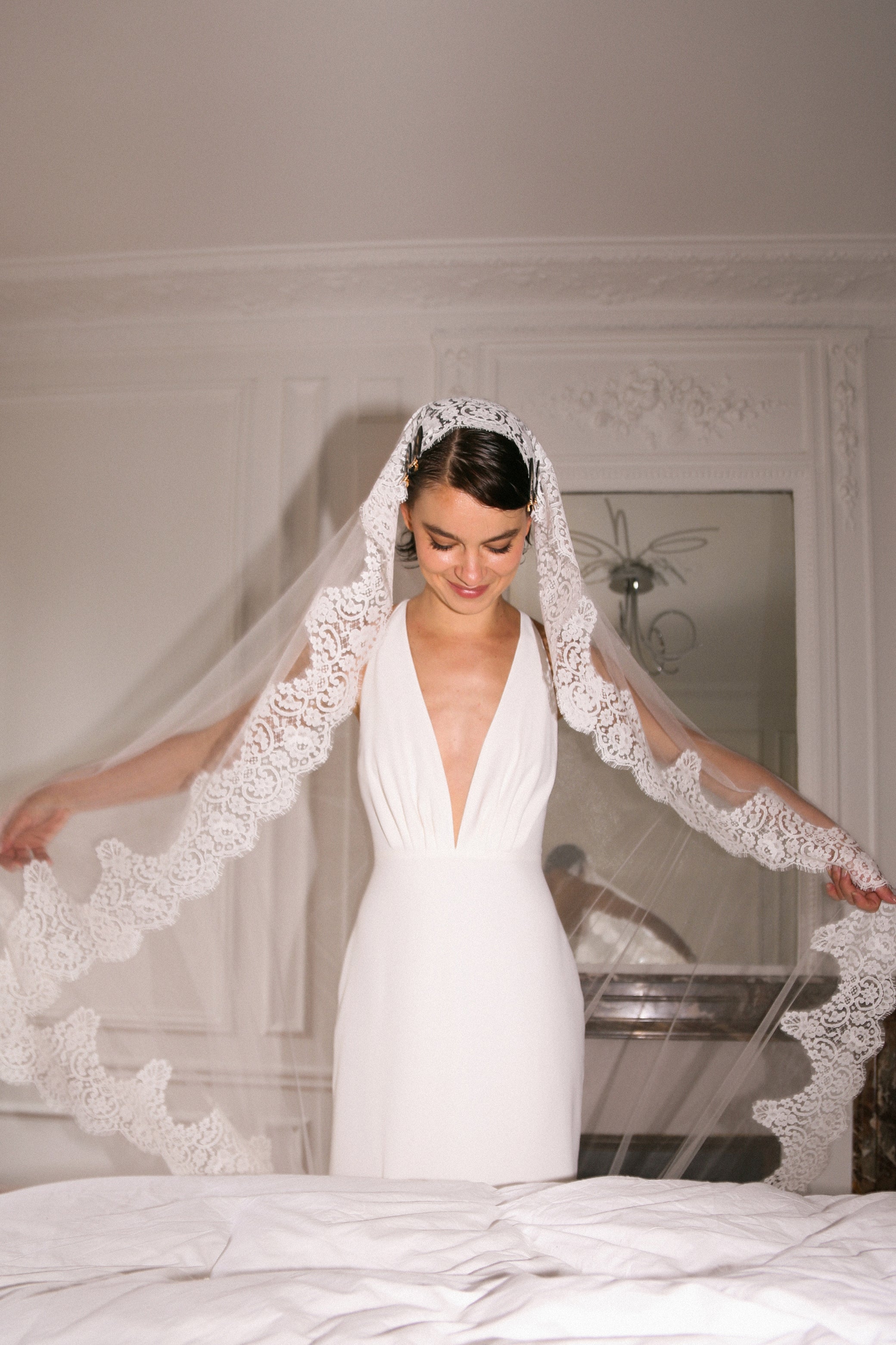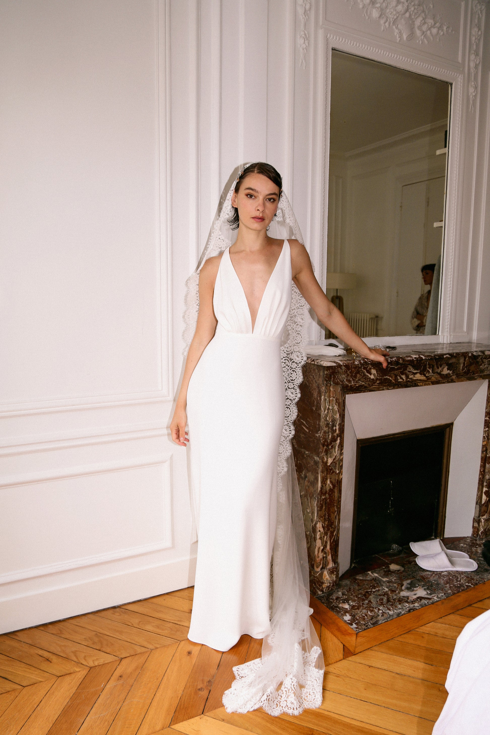 Osani est le temps deux de notre robe iconique Calvi. À l’écoute de nos mariées, nous avons fait un dos décroisé encore plus épuré et une jupe sans fente.