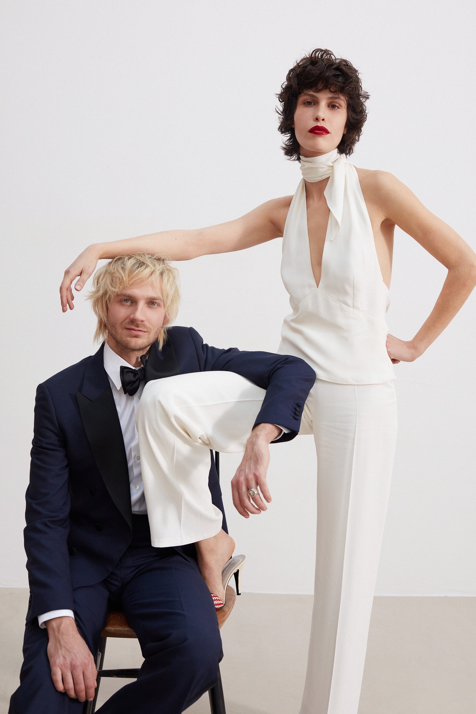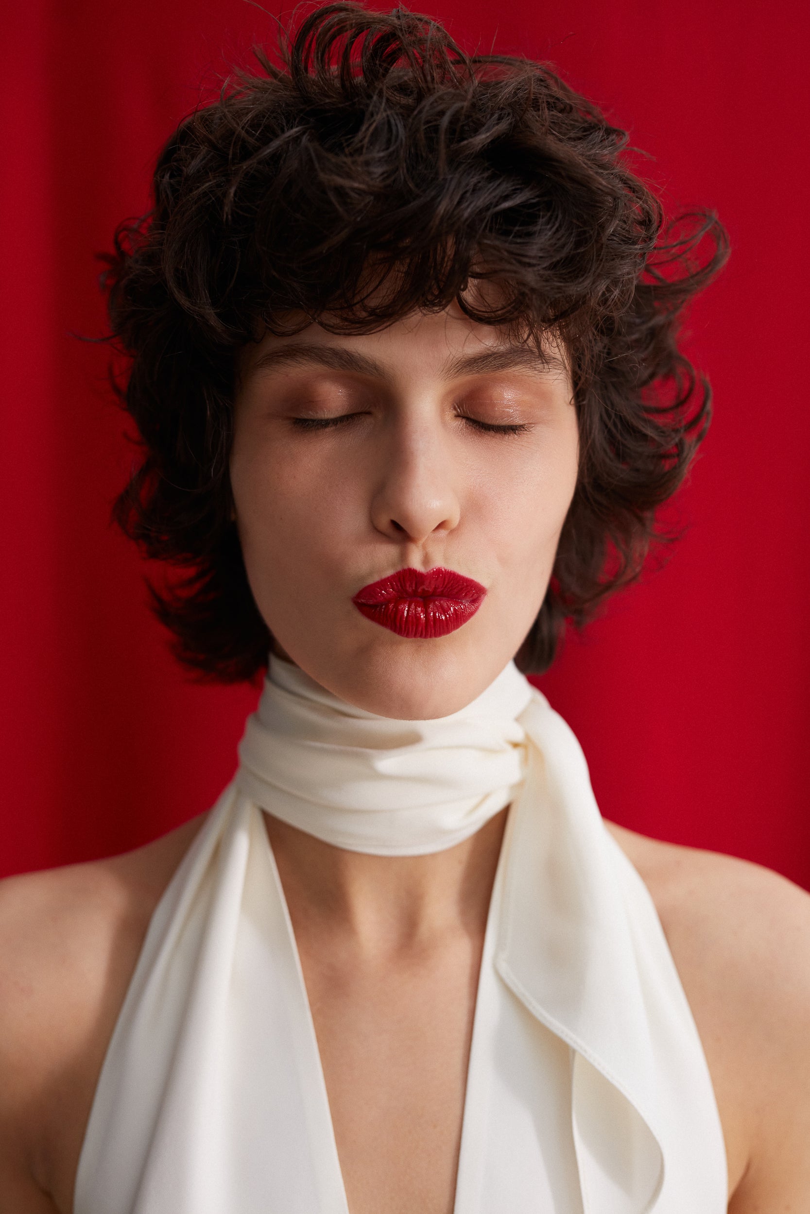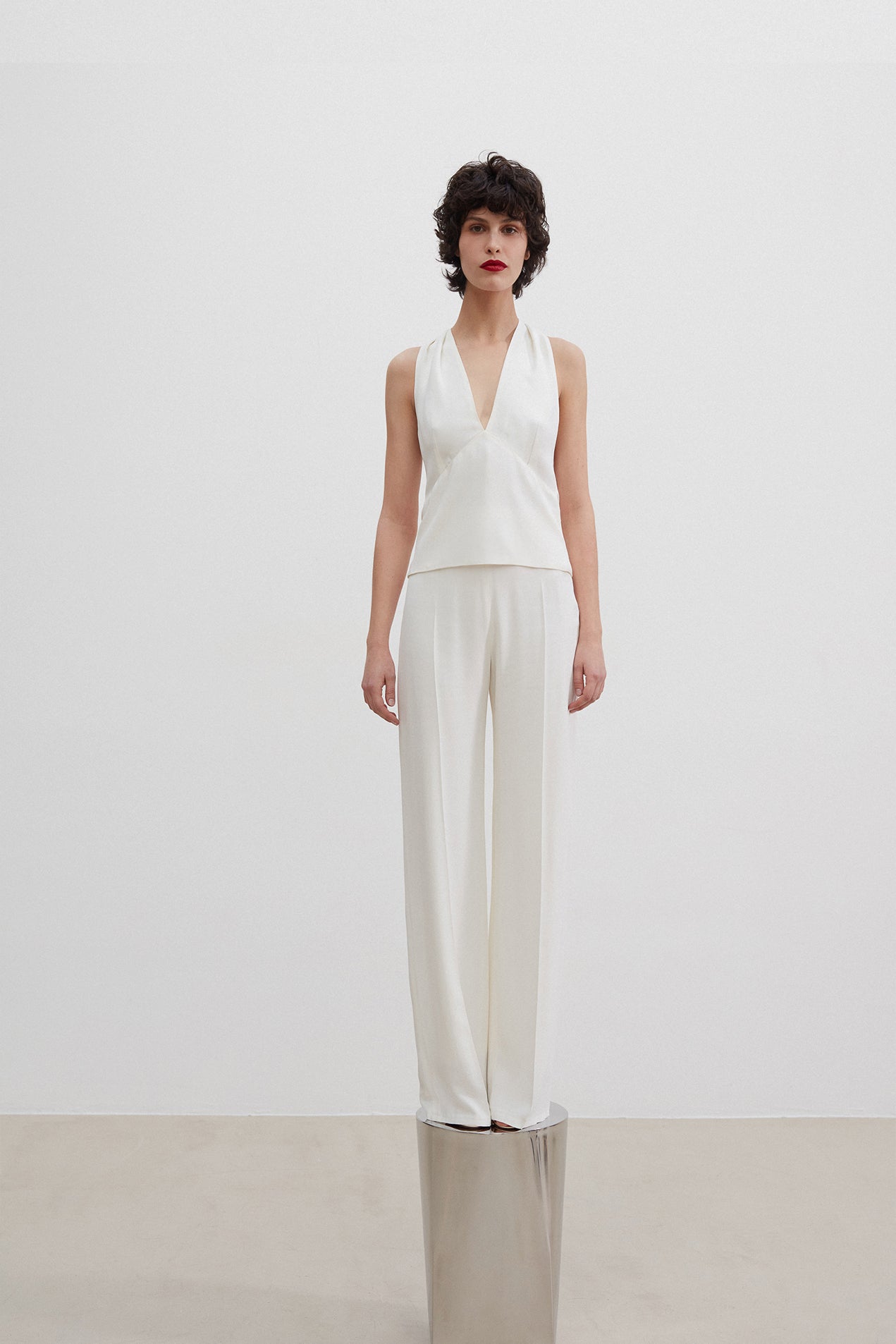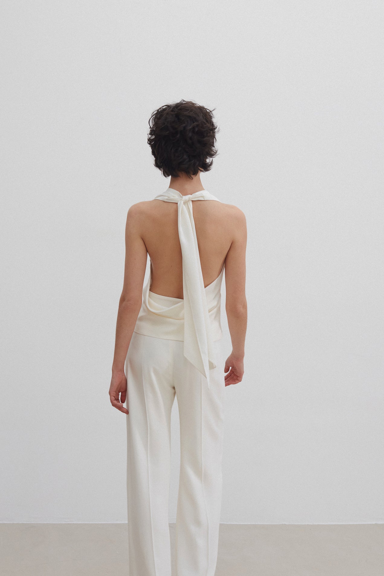 Top décolleté V, écharpe à nouer de deux façon: autour du cou ou dans le dos. Décolleté dos bénitier.